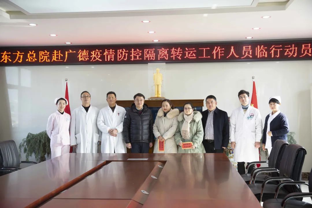 出征在即,时间紧迫,医院集团举行了简单的临行动员会,为严雪医生和任慧慧护师送行。江永强董事长向两名防疫人员进行了表扬与鼓励,同时准备了2000元现金,以供她们购置随行物品。“生命重于泰山,疫情就是命令。大家选择逆行而上,是为了医者担当而行,为了国家使命而行!。”江永强董事长叮嘱道:“在支援广德期间,你们代表着东方医院集团的形象与实力,同时东方医院集团将成为你们的坚强后盾,机关科室和后勤部门会全力做好相关工作,让我们的英雄没有后顾之忧。”