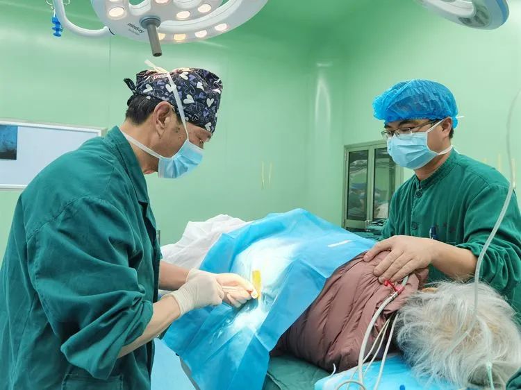 经过充分的术前准备,手术如期进行。手术室团队密切配合,麻醉科主任卜美林、副主任汪敏携手,一边安慰瘦弱的老人,一边熟练的从腰部棘突间的空隙进入,行腰硬联合麻醉,先为手术安全提供强大保障。集团骨科医疗中心总院副主任柏文昆主刀,王怀波主任配合,常规消毒、熟练入路.....柏主任手法娴熟,仅半小时不到,手术就顺利结束。术后,老人恢复良好,第二天就已经下床活动进行功能锻炼。