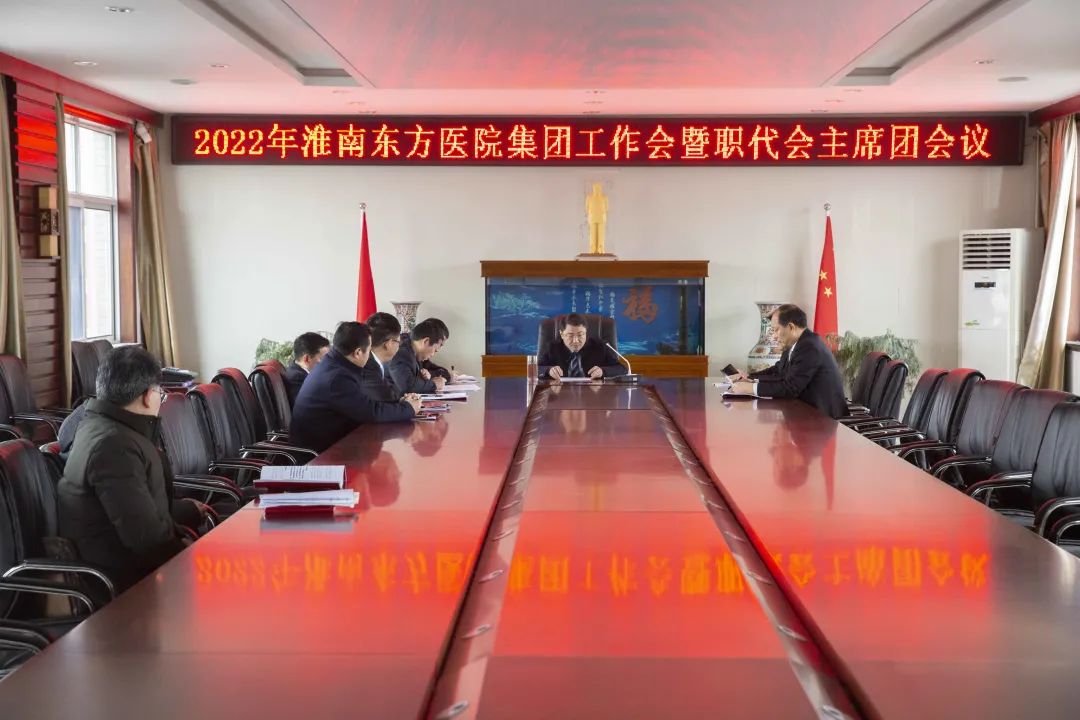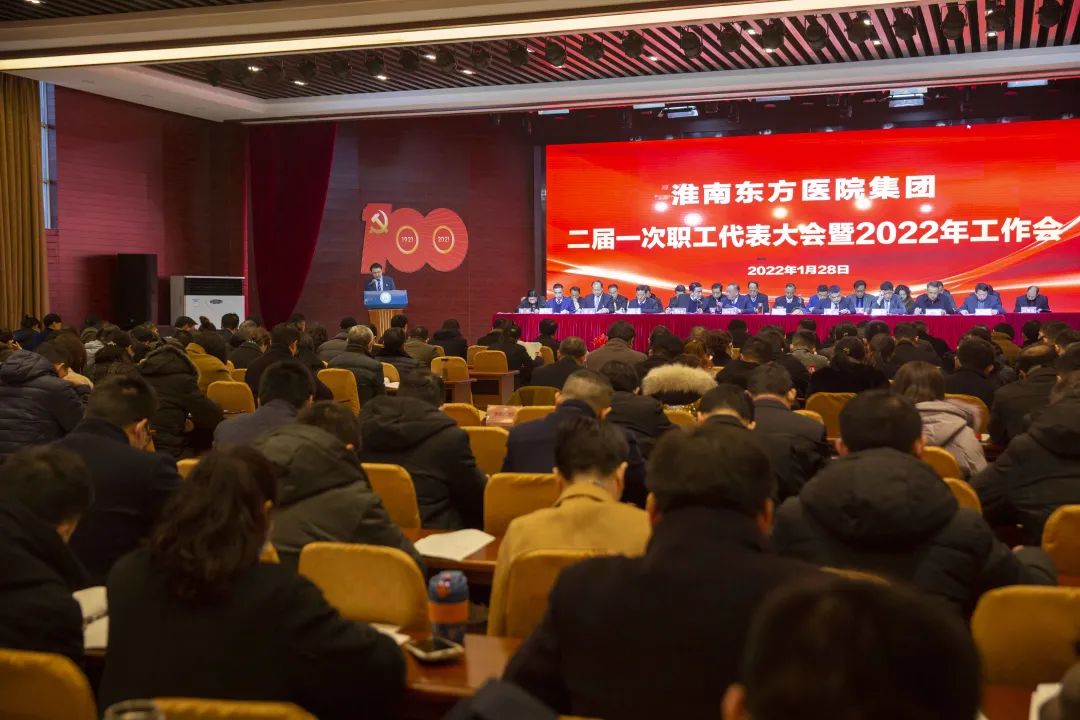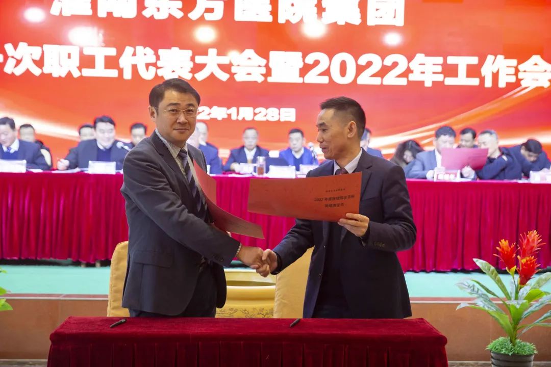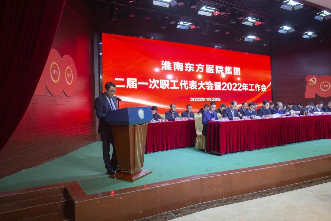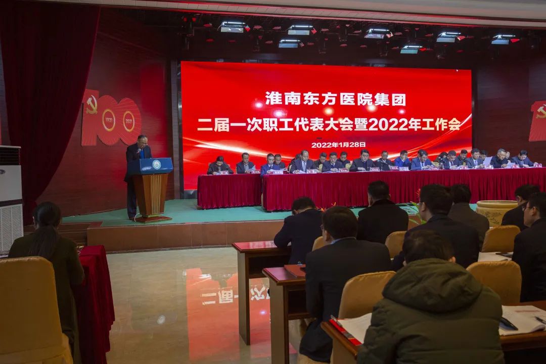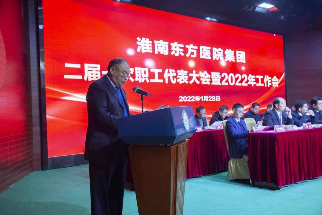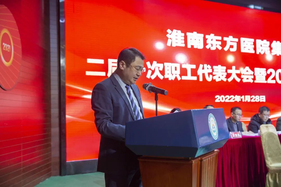江永强董事长首先代表集团作党委和董事会工作报告。2021年,医院集团在疫情和医保支付改革的双重冲击下,全体东方人守望相助,执着坚守,交出了一份令人满意的东方答卷。这一年,集团领导班子顺利完成新老交替,实现平稳过渡,集团整体运营健康、有序、稳定,先后办成了一批要事、干好了一批大事、解决了一批难事、促成了一批喜事,实现了稳步向前发展。回顾2021,医院集团通过职级改革树目标、立方向、定标准,加强中层考核,强化责任担当,选拔出一批想干事、能干事、干成事的优秀人才,为集团高质量发展、提升核心竞争力奠定了坚实基础;通过推动财务、药事、医保、信息等部门集团化管理,上下一盘棋,发挥出显著作用;通过病区整合,优化人力资源配置,提高了运行效率,促进了服务提升;通过加强行政和财务管理,强化统一招标、议价对比、体量压价等方式发挥集团独特优势,开源节流取得显著成效;通过关爱职工、坚持米油文化、普涨工资,充分保障了员工利益,实现了员工人均年收入同比较大幅度增长。2021年,集团坚持技术创新、服务创新、靠前服务,让市民“足不出淮”就享受到真正高水平的诊疗服务,一系列便民惠民举措赢得政府信任、百姓称赞。集团以“5G+智慧医疗”战略合作项目为契机,全面升级医院信息化系统,实现数据互联互通,“整体上云”。充分发挥安徽理工大学附属医院等平台优势,科研、教学工作取得重大突破,获得诸多荣誉。医院集团坚持党建引领,扎实开展党史学习教育,深入开展“我为群众办实事”实践活动,推进党建与医疗工作深度融合,努力打造社会组织党建工作标杆,为医院集团发展提供了坚强的政治保证。多措并举下,集团发展展现了强劲动力和生命力,国家卫健委及省、市领导多次莅临医院视察指导,对医院创新管理、疫情防控、预防接种等工作给予充分肯定;医院集团连续多年在“中国医院竞争力排行榜”中名列前茅,总院、肿瘤医院、凤凰医院也同时登榜,充分彰显了医院集团在全国的竞争力和影响力;集团在安徽省紧密型城市医联体建设暨城市卫生工作现场会上的经验分享,受到省卫健委领导多次表扬,以及省内同行的一致认可,社会影响力空前提升。