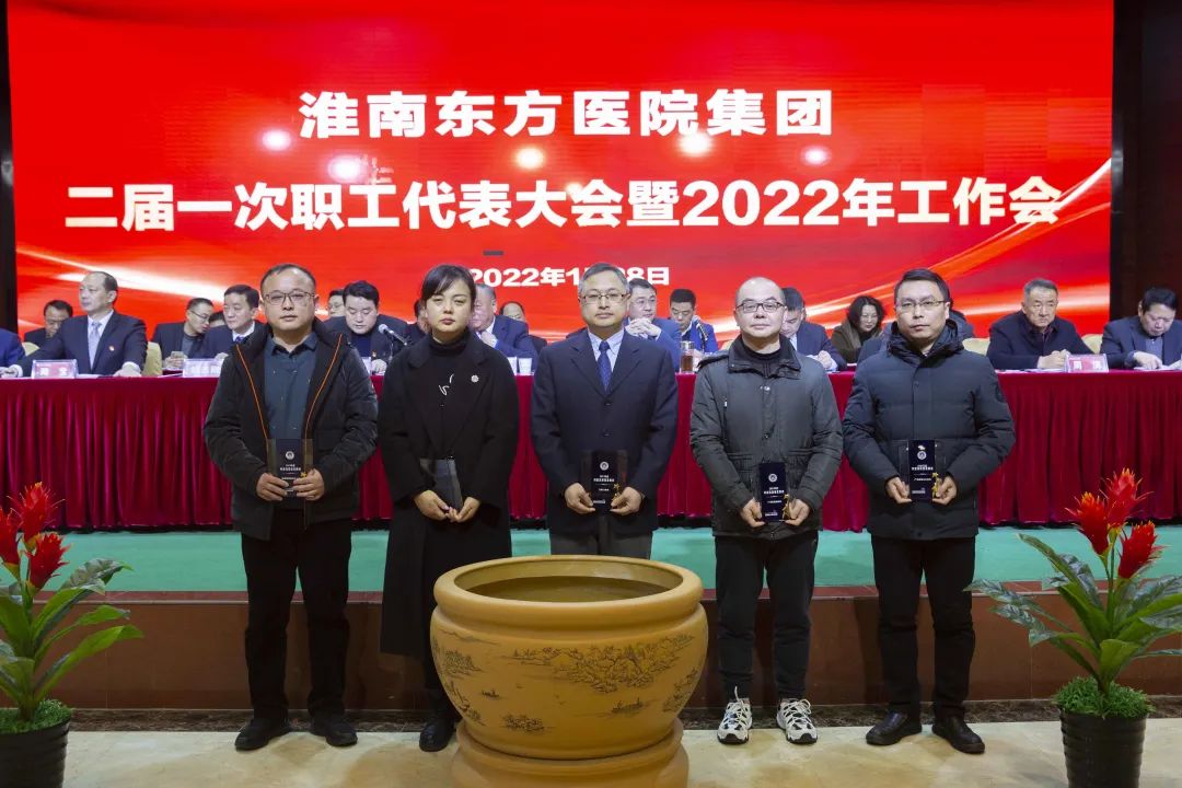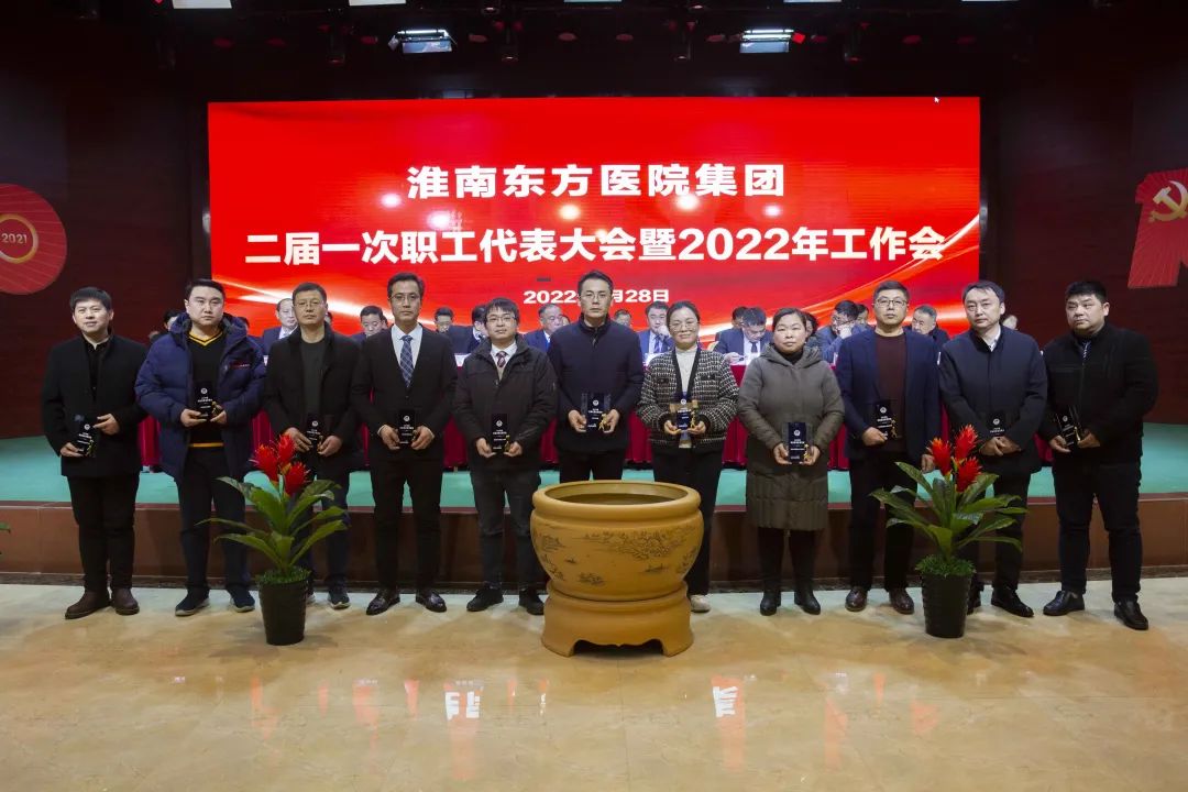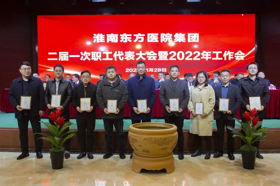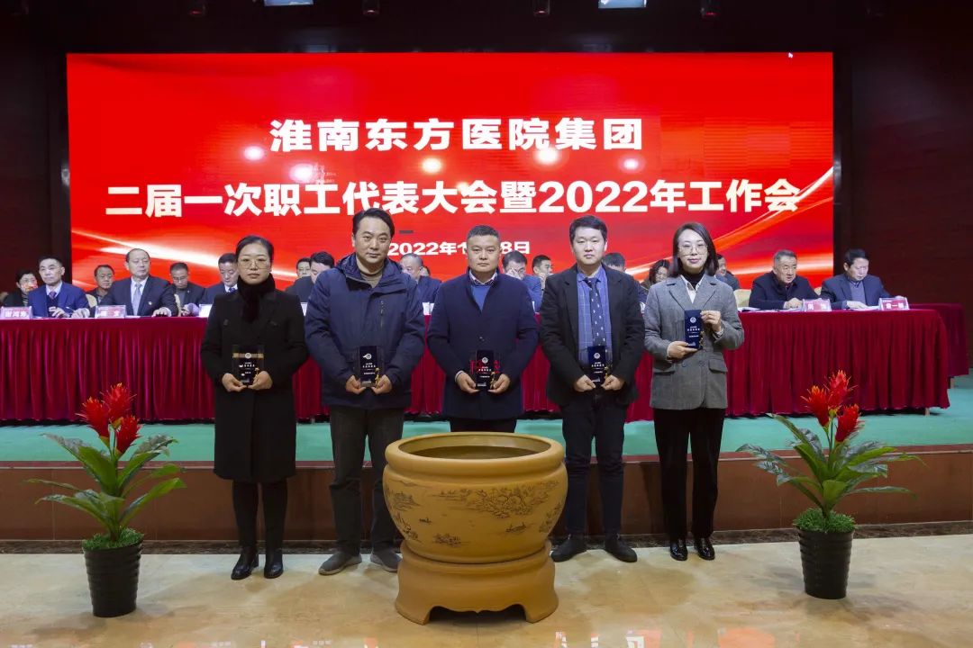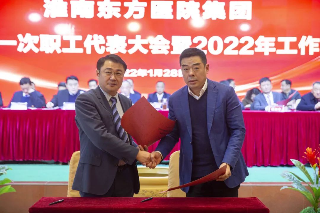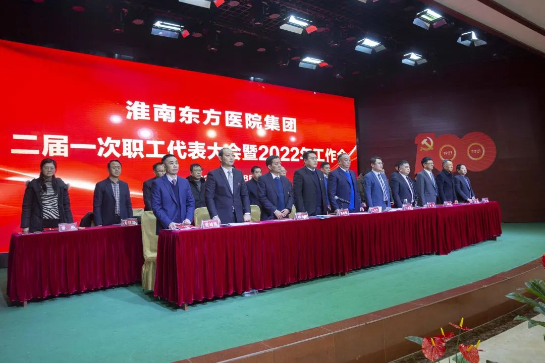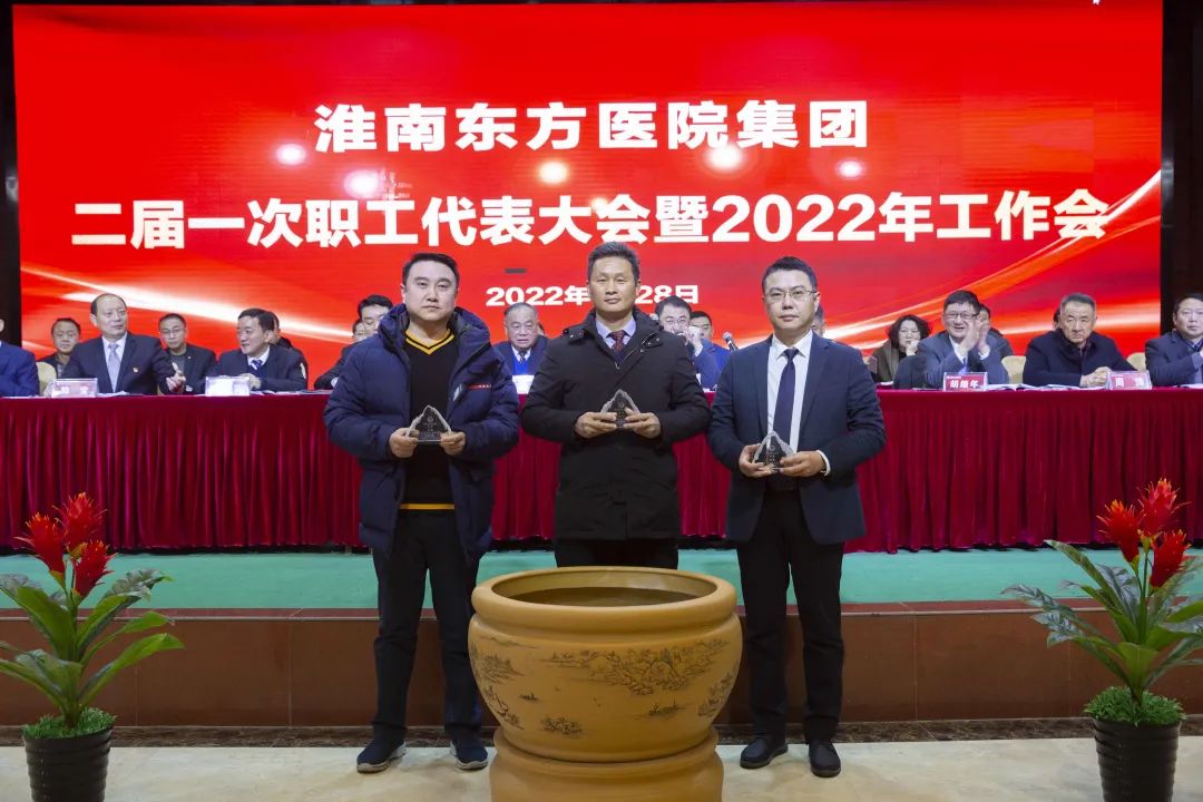 江永强董事长首先代表集团作党委和董事会工作报告。2021年,医院集团在疫情和医保支付改革的双重冲击下,全体东方人守望相助,执着坚守,交出了一份令人满意的东方答卷。这一年,集团领导班子顺利完成新老交替,实现平稳过渡,集团整体运营健康、有序、稳定,先后办成了一批要事、干好了一批大事、解决了一批难事、促成了一批喜事,实现了稳步向前发展。回顾2021,医院集团通过职级改革树目标、立方向、定标准,加强中层考核,强化责任担当,选拔出一批想干事、能干事、干成事的优秀人才,为集团高质量发展、提升核心竞争力奠定了坚实基础;通过推动财务、药事、医保、信息等部门集团化管理,上下一盘棋,发挥出显著作用;通过病区整合,优化人力资源配置,提高了运行效率,促进了服务提升;通过加强行政和财务管理,强化统一招标、议价对比、体量压价等方式发挥集团独特优势,开源节流取得显著成效;通过关爱职工、坚持米油文化、普涨工资,充分保障了员工利益,实现了员工人均年收入同比较大幅度增长。2021年,集团坚持技术创新、服务创新、靠前服务,让市民“足不出淮”就享受到真正高水平的诊疗服务,一系列便民惠民举措赢得政府信任、百姓称赞。集团以“5G+智慧医疗”战略合作项目为契机,全面升级医院信息化系统,实现数据互联互通,“整体上云”。充分发挥安徽理工大学附属医院等平台优势,科研、教学工作取得重大突破,获得诸多荣誉。医院集团坚持党建引领,扎实开展党史学习教育,深入开展“我为群众办实事”实践活动,推进党建与医疗工作深度融合,努力打造社会组织党建工作标杆,为医院集团发展提供了坚强的政治保证。多措并举下,集团发展展现了强劲动力和生命力,国家卫健委及省、市领导多次莅临医院视察指导,对医院创新管理、疫情防控、预防接种等工作给予充分肯定;医院集团连续多年在“中国医院竞争力排行榜”中名列前茅,总院、肿瘤医院、凤凰医院也同时登榜,充分彰显了医院集团在全国的竞争力和影响力;集团在安徽省紧密型城市医联体建设暨城市卫生工作现场会上的经验分享,受到省卫健委领导多次表扬,以及省内同行的一致认可,社会影响力空前提升。