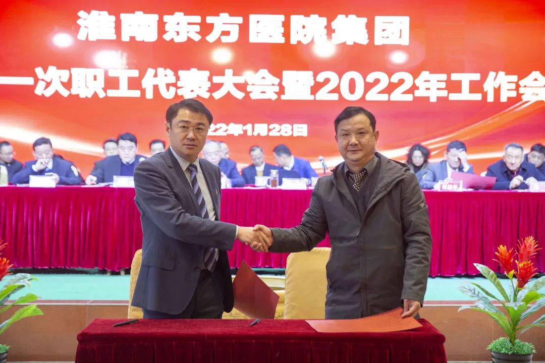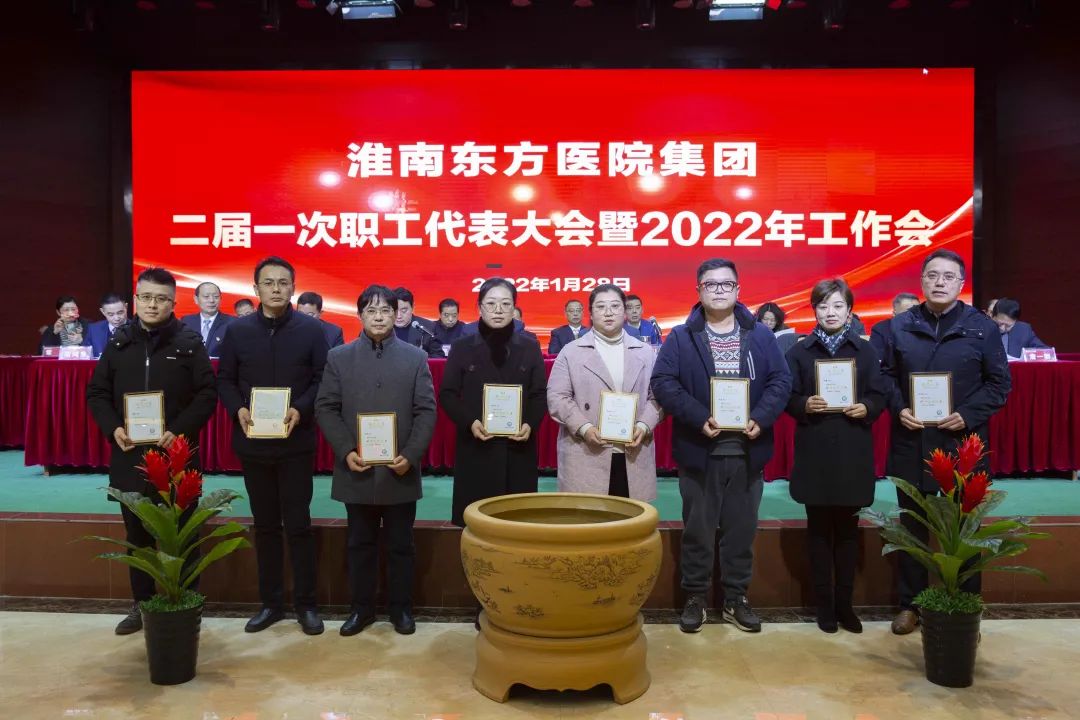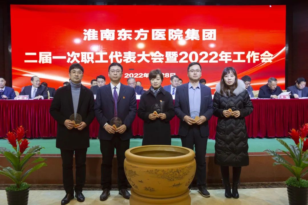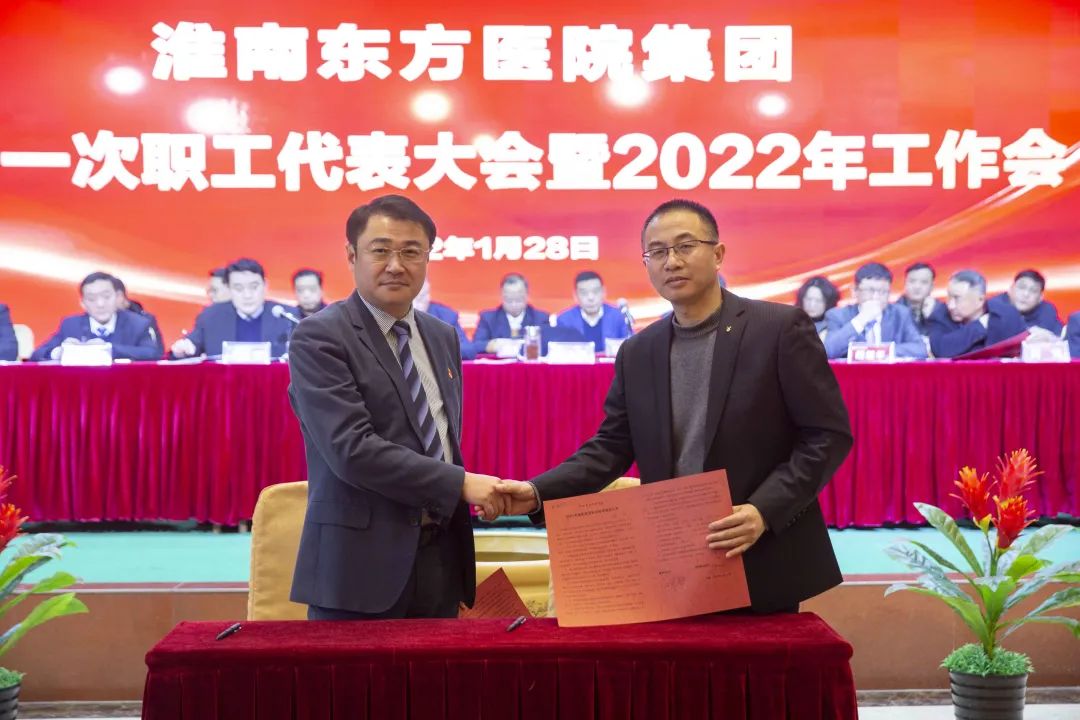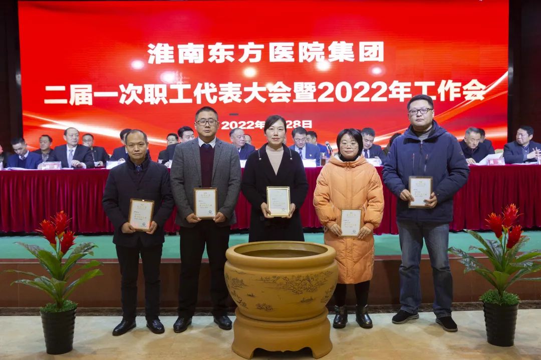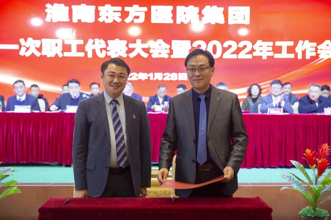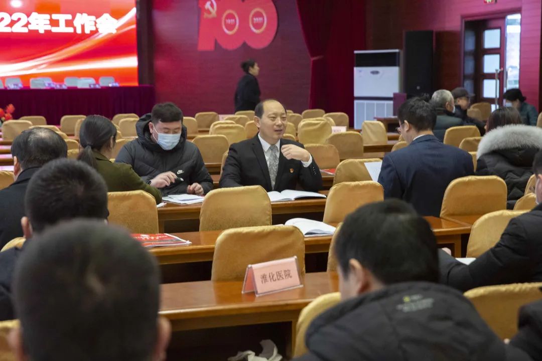 江永强董事长首先代表集团作党委和董事会工作报告。2021年,医院集团在疫情和医保支付改革的双重冲击下,全体东方人守望相助,执着坚守,交出了一份令人满意的东方答卷。这一年,集团领导班子顺利完成新老交替,实现平稳过渡,集团整体运营健康、有序、稳定,先后办成了一批要事、干好了一批大事、解决了一批难事、促成了一批喜事,实现了稳步向前发展。回顾2021,医院集团通过职级改革树目标、立方向、定标准,加强中层考核,强化责任担当,选拔出一批想干事、能干事、干成事的优秀人才,为集团高质量发展、提升核心竞争力奠定了坚实基础;通过推动财务、药事、医保、信息等部门集团化管理,上下一盘棋,发挥出显著作用;通过病区整合,优化人力资源配置,提高了运行效率,促进了服务提升;通过加强行政和财务管理,强化统一招标、议价对比、体量压价等方式发挥集团独特优势,开源节流取得显著成效;通过关爱职工、坚持米油文化、普涨工资,充分保障了员工利益,实现了员工人均年收入同比较大幅度增长。2021年,集团坚持技术创新、服务创新、靠前服务,让市民“足不出淮”就享受到真正高水平的诊疗服务,一系列便民惠民举措赢得政府信任、百姓称赞。集团以“5G+智慧医疗”战略合作项目为契机,全面升级医院信息化系统,实现数据互联互通,“整体上云”。充分发挥安徽理工大学附属医院等平台优势,科研、教学工作取得重大突破,获得诸多荣誉。医院集团坚持党建引领,扎实开展党史学习教育,深入开展“我为群众办实事”实践活动,推进党建与医疗工作深度融合,努力打造社会组织党建工作标杆,为医院集团发展提供了坚强的政治保证。多措并举下,集团发展展现了强劲动力和生命力,国家卫健委及省、市领导多次莅临医院视察指导,对医院创新管理、疫情防控、预防接种等工作给予充分肯定;医院集团连续多年在“中国医院竞争力排行榜”中名列前茅,总院、肿瘤医院、凤凰医院也同时登榜,充分彰显了医院集团在全国的竞争力和影响力;集团在安徽省紧密型城市医联体建设暨城市卫生工作现场会上的经验分享,受到省卫健委领导多次表扬,以及省内同行的一致认可,社会影响力空前提升。