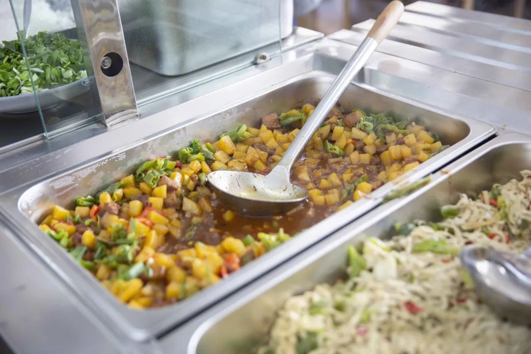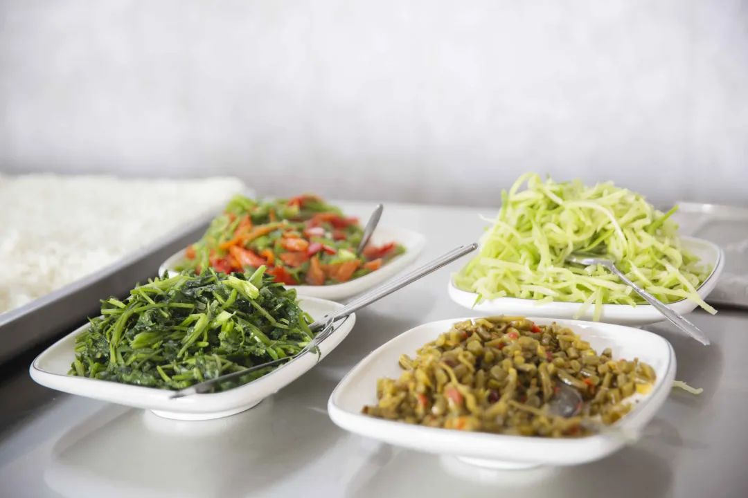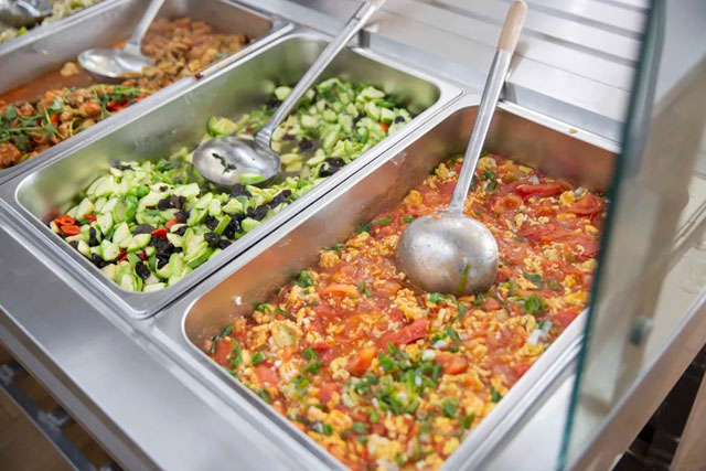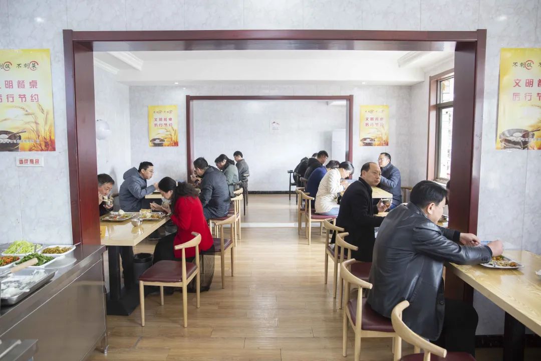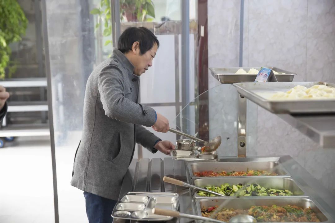 装修一新的员工食堂位于急诊科西北方,餐厅整洁温馨,典雅大方。走进餐厅内,16个方形餐桌椅整齐有序,环境宽敞明净,前厅后厨的条件都有了极大的提升,不仅更加干净整洁,饭食品种也更加丰富。食堂采用自助餐模式,五菜一汤每天轮换,并提供各色小菜,主食提供米饭、包子和饺子,满足不同人群的饮食习惯。