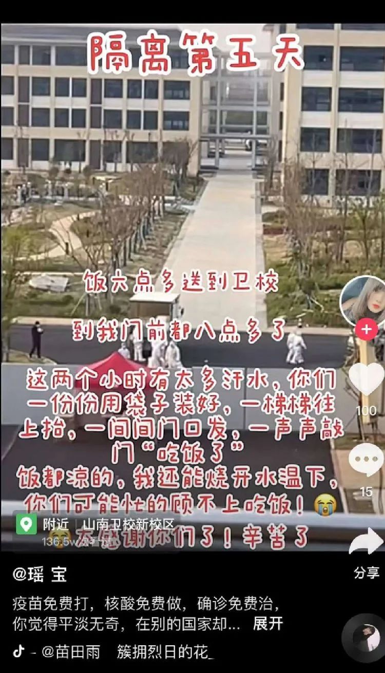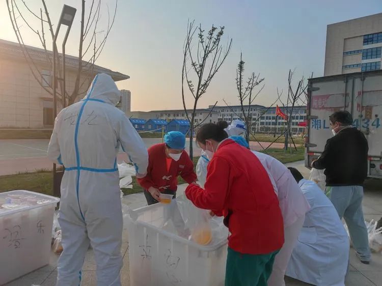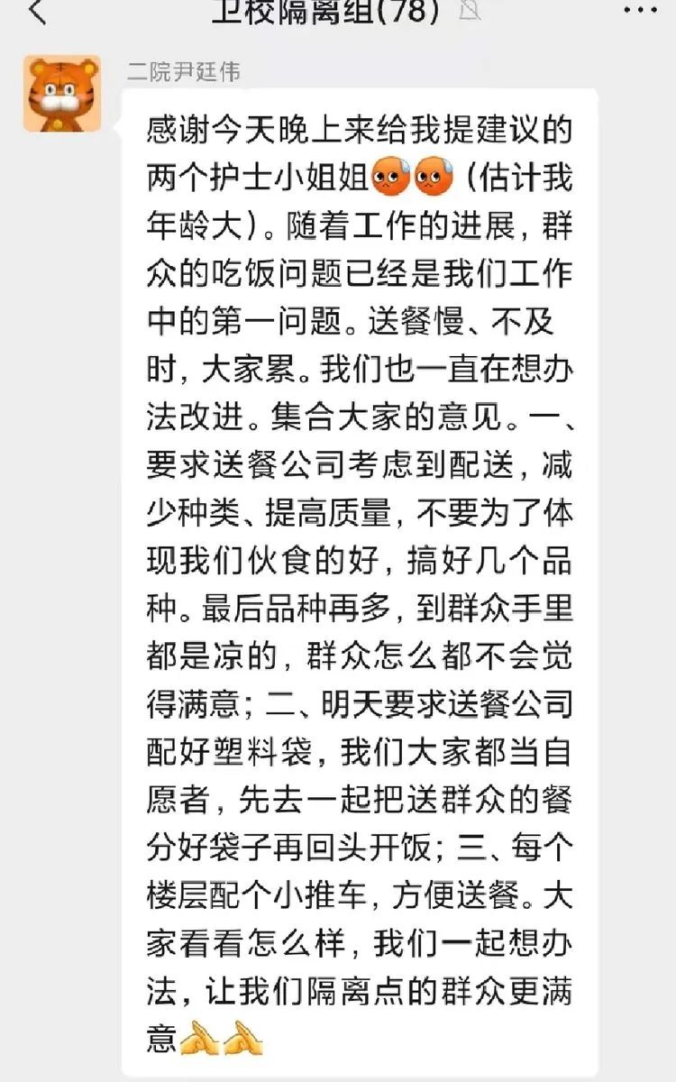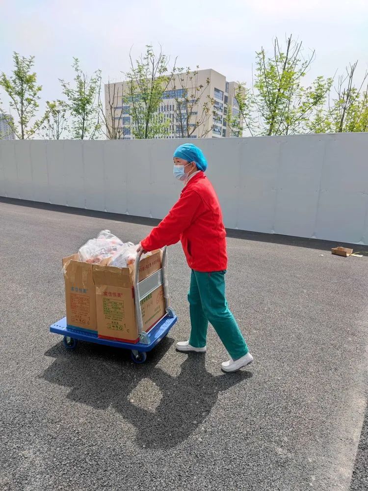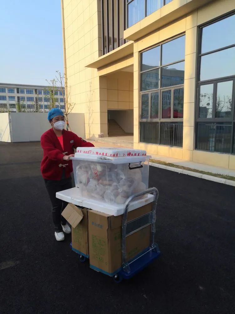 由于卫校隔离点现有七百余名隔离群众,分住在四栋楼里。送餐工作是个大工程,送餐人员六个楼层跑下来,每次送餐都需要两个多小时,饭菜送到群众的手里,有时候都是凉的。袁晓燕护士长听取群众的意见后,立刻给隔离点的领导提出了合理化建议。