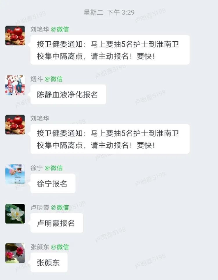 接到通知,血液净化中心陈静、儿科卢明霞、影像中心张颜东、呼吸科袁晓燕、SICU徐宁五名护士长来不及跟家人告别和回家中收拾生活用品,第一时间直接从工作岗位赶到急诊科集合,乘车前往淮南卫校隔离点。