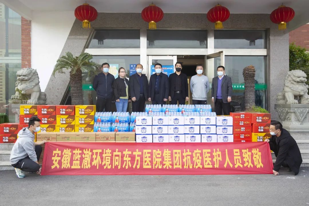 4月7日上午,安徽蓝澈环境科技有限公司总经理杨芳一行为淮南东方医院集团捐赠淮南牛肉汤、牛奶和剐水各50箱。