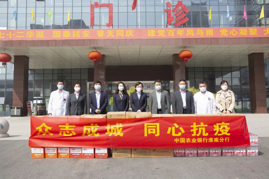4月7日上午,中国农业银行淮南分行党委委员、副行长俞路平一行为淮南东方医院集团捐赠消毒液6箱、84消毒液6箱、口罩2箱、免洗手消毒液1箱、方便面、水各20箱。