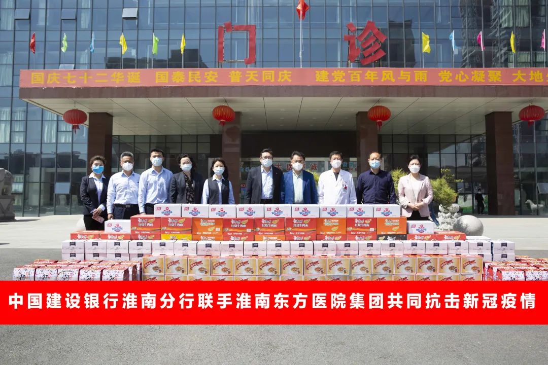 4月8日上午,中国建设银行淮南分行党委书记行长张松茂一行为淮南东方医院集团捐赠康师傅方便面50件、娃哈哈八宝粥30件、特仑苏牛奶80件、水晶富士苹果30件、双汇火腿肠12件。