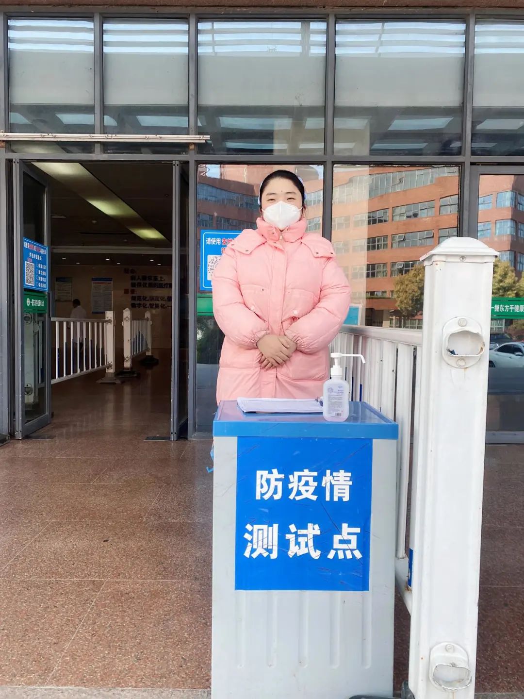 ▲李苗苗护士在住院部大楼出入口核查登记