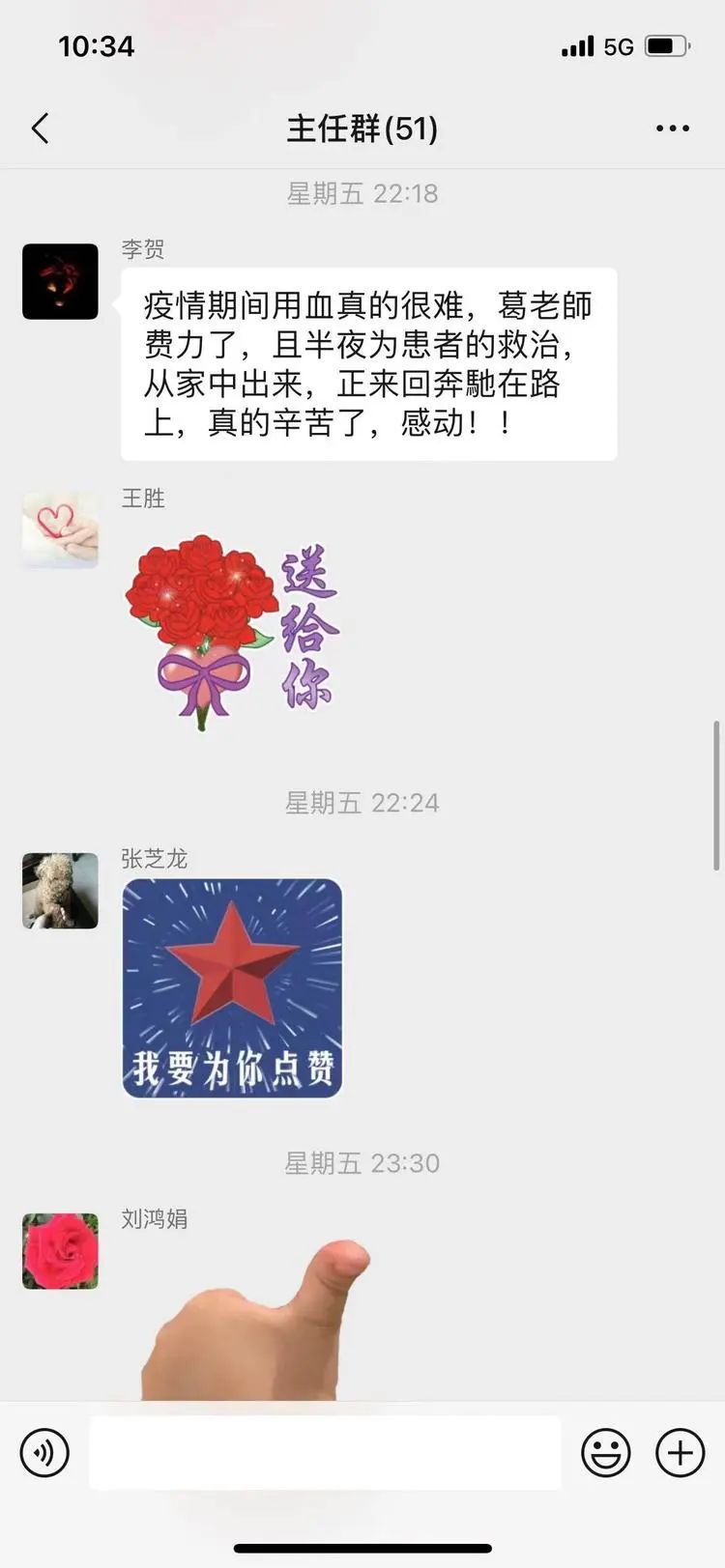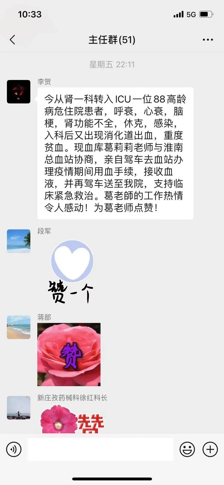 本在老年肾内科住院的陈爷爷突发昏迷、呼吸浅慢,转入ICU。进入ICU时,患者病情垂危:呼吸衰竭、心力衰竭、心肌梗死、脑梗死、重度感染并处于休克状态,随后又自解大量柏油样黑便,大便隐血呈阳性,诊断消化道出血,呈重度贫血状态,需立刻进行纠正贫血治疗。这时已是晚上9点多,李贺主任联系血库的葛利莉老师,将患者情况告知。葛利莉立刻联系淮南市中心血站,商量用血事宜。正值疫情期间,没有献血人员,血库存血量告急,用血十分困难。经过多方协调,葛利莉决定自己从家开车前往血站办理疫情期间用血手续,并亲自将血送到医院,这样才能保证患者可以及时输上血,最快得到救治!