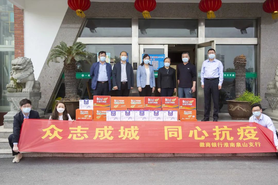 4月27日上午,徽商银行淮南分行泉山支行方静行长、淮南分行授信部袁路经理带队向淮南东方医院集团捐赠84消毒液4箱、方便面20箱、牛奶4箱。