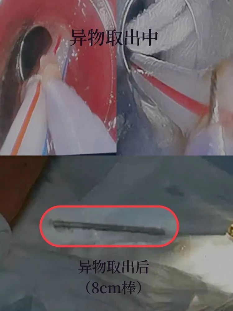 内镜室内,当8厘米长的塑料棒子被顺利取出的一刹那,在场医护们齐刷刷的一声“哎哟”,这才松了口气。此时外面的家属得知异物已顺利取出,激动的互相抱在一起。
