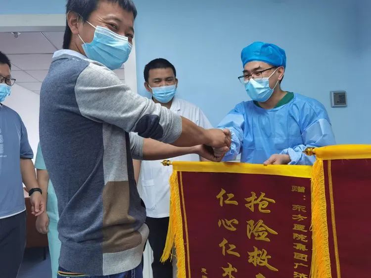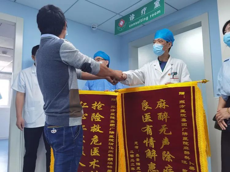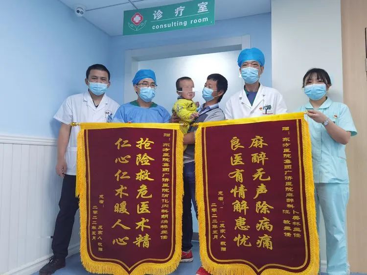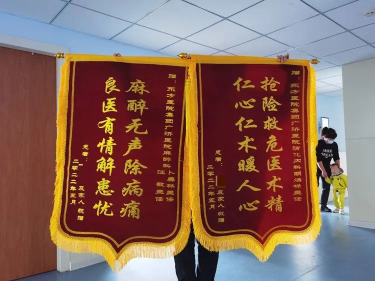 “差一点就要开刀了,要不是广济医院的医生们技术好,用胃镜帮我们取出来(异物),小孩就只能开刀了。家里人心都提到嗓子眼了,特别感谢广济医院的医生们,中午加班加点,太感谢他们了。”再次来到广济医院,小娃一家把锦旗送到了医生的手中,和医生们一边握手,一边诉说着感谢的话。