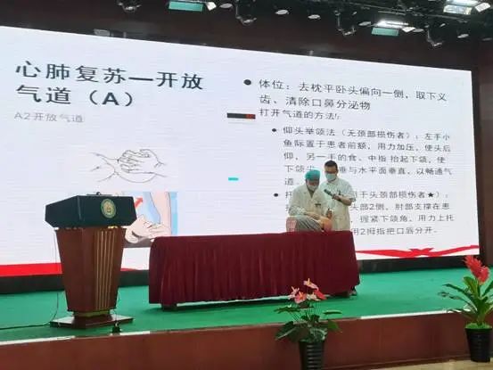 总院心内科叶平主任通过PPT的形式,向大家讲解了心肺复苏的理论知识,结合教学视频,重点讲解了心肺复苏按压部位、频率、深度、按压及吹气比例等,为新入职、初级职称人员带去了一场干货满满的学术大餐。