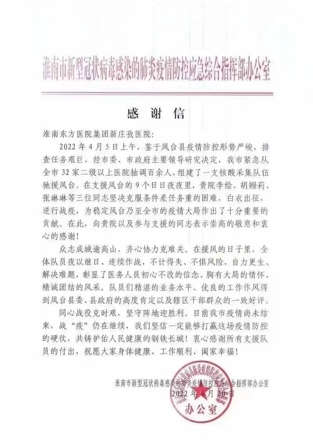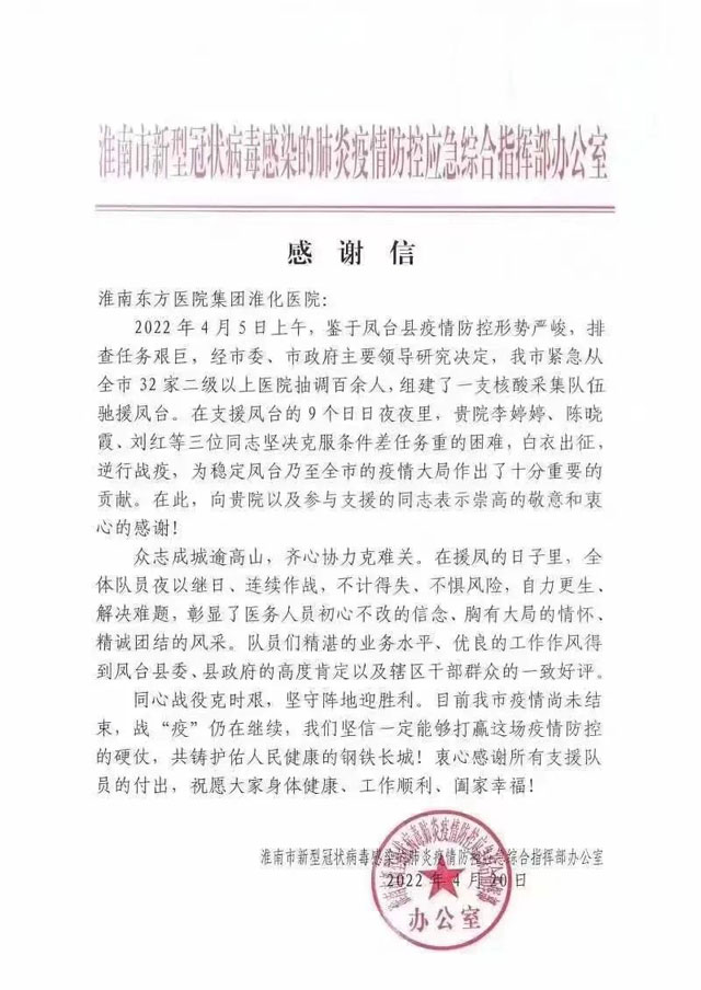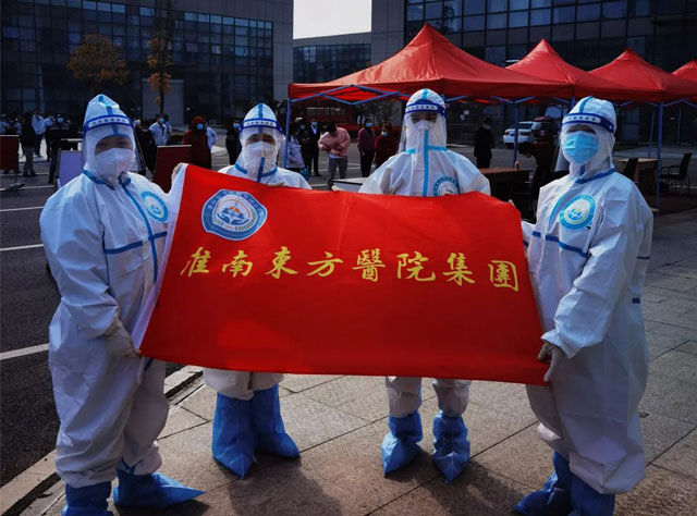 处于疫情“风暴眼”中心的凤凰医院全体医护人员更是奋战在抗击疫情的最前沿。面对疫情,500名职工坚守岗位,一方面保证在院患者的医疗安全,防止院内感染,另一方面抽调人员深入凤台县城、各乡镇开展排查工作,助力当地疫情顺利平稳地度过最艰难的时刻。期间,涌现出了一大批无惧个人安危,主动请战一线的优秀医护人员。东方总院发现了田家庵地区第一例阳性病例,处置及时,流程规范,得到省疾控中心的高度认可。全集团包括肿瘤医院、广济医院、新庄孜医院等五大六小医院的3700名东方职工日夜坚守岗位,在保证日常医疗工作的同时,无条件支援全市各方舱医院、健康驿站、隔离点和核酸采样点、防控点,用严明的组织纪律和专业、规范的操作获得各方认可,体现出了淮南东方医院集团的凝聚力、向心力和敢闯、敢拼、敢担当的东方精神。