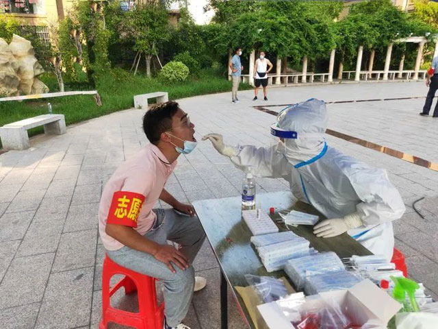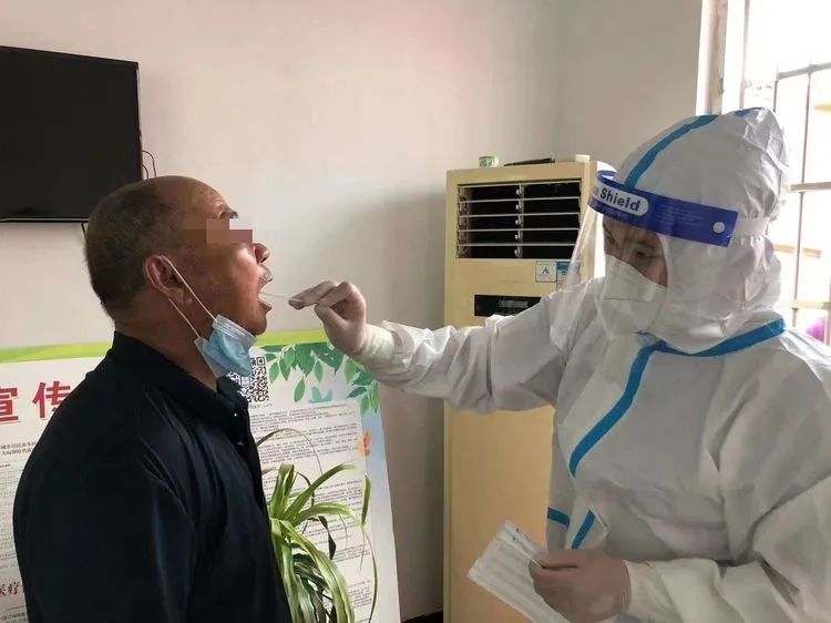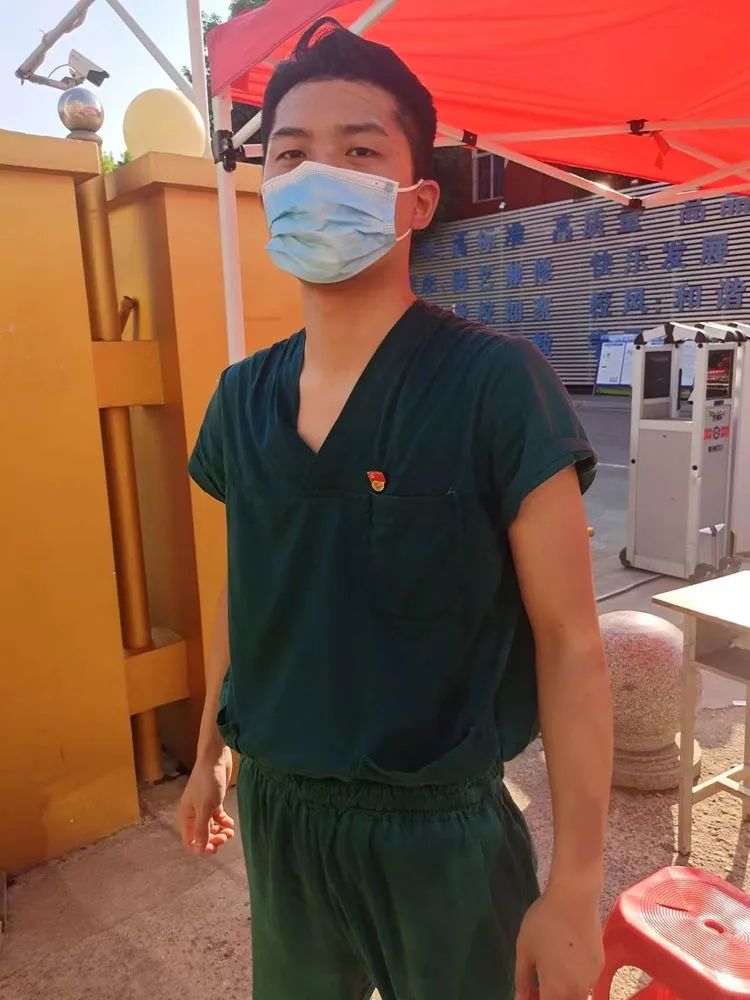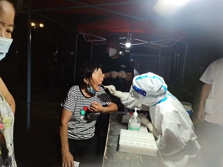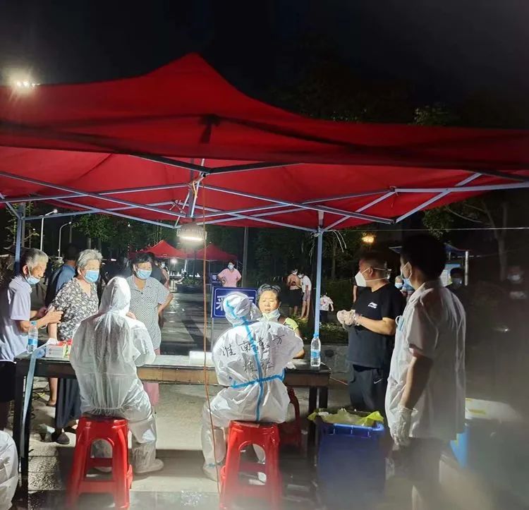 坐在简易的铁皮棚里,他和同事开始为居民采样,闷热超出预期,汗不停的顺着后背流进腰部,最麻烦的是脸上的汗,一旦滴在眼睛上,不得不用力眨眼才能继续干活。一次次抬起手臂、消毒、采样,一次次大声的喊“请张嘴”、“谢谢”,体力逐渐消耗。当天晚上7点四十,他们完成了采样工作,后来他们才知道,这是后来几天的支援中,结束最早的一天。