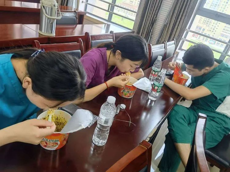 凌晨一点半,终于结束了,正在脱防护服的张晓蕾,突然眼前一黑,瘫坐在地上。旁边的同事赶紧拿来藿香正气水和冰水,轮流为她降温。缓过来之后,他们开始吃晚饭。细心的张晓蕾发现,平时吃饭不挑嘴,饿起来要吃两桶泡面垫垫的徐浩宇今天没动筷子。“浩宇,怎么不吃饭?”她问。“晓蕾姐,我们两个今天采了3000多,他累得不想吃了。”同组的王欢替他回答。