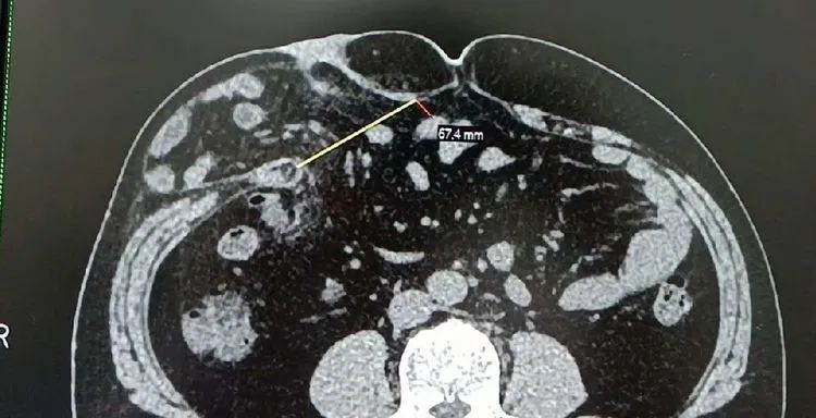 因“反复腹痛1年余,再发1周”,黄师傅(化名)前往医院就诊,查体:腹平,未见肠型及蠕云波,右季肋区饱满,可触及一5*7cm左右质软包块,触痛阴性,腹软,肝脾肋下未及,剑突下及脐周深压不适,余腹无明显压痛、反跳痛及肌卫,Murphy症(一)。CT可见:右腰部软组织变薄,部分脂肪组织疝入皮下,疝口宽约74mm。影像学诊断:右腰部脂肪疝。