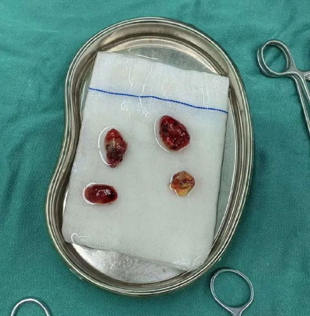 体检发现颈部包块一月,伴有下肢和面部骨痛,郑女士就诊广济医院普外科,甲状腺旁腺彩超示:甲状腺两侧叶背侧异常回声结节,考虑甲状旁腺腺瘤。辅助检查,甲状旁腺激素2404.40pg/ml。查体见右侧甲状腺突出包块,大小约2*2cm;左侧甲状腺可触及一约2*3cm大小包块。进步一检查后,明确诊断为“甲状旁腺肿瘤合并甲状旁腺功能亢进”,随后就出现了本文开头的一幕。
