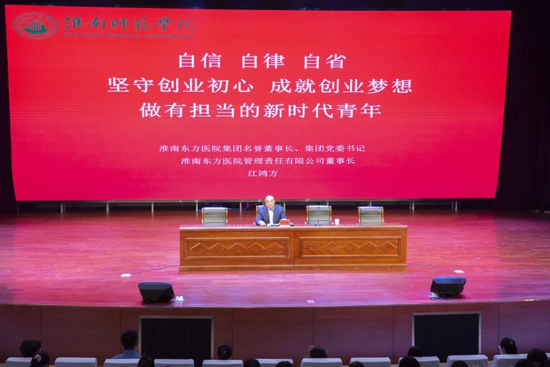淮南东方医院集团始终围绕“教学医院”创建工作,遵循医、教、研可持续发展之路,以教促医,医教相长,各项教学工作一直在有序开展。长期与淮南师范学院等院校进行合作,开展多种形式的课程教学工作。江鸿方教授在受聘之前也曾多次前往淮南师范学院为在校大学生进行授课、交流。2021年11月3日,江鸿方教授在淮南师范学院报告厅进行了《自信、自律、自省——坚守创业初心,成就创业梦想,做有担当的新时代青年》的讲课,结合自身的经历鼓励即将走向社会的大学生们在广阔的人生舞台上站稳脚跟、施展才华,实现人生价值,受到了学生们的一致好评。