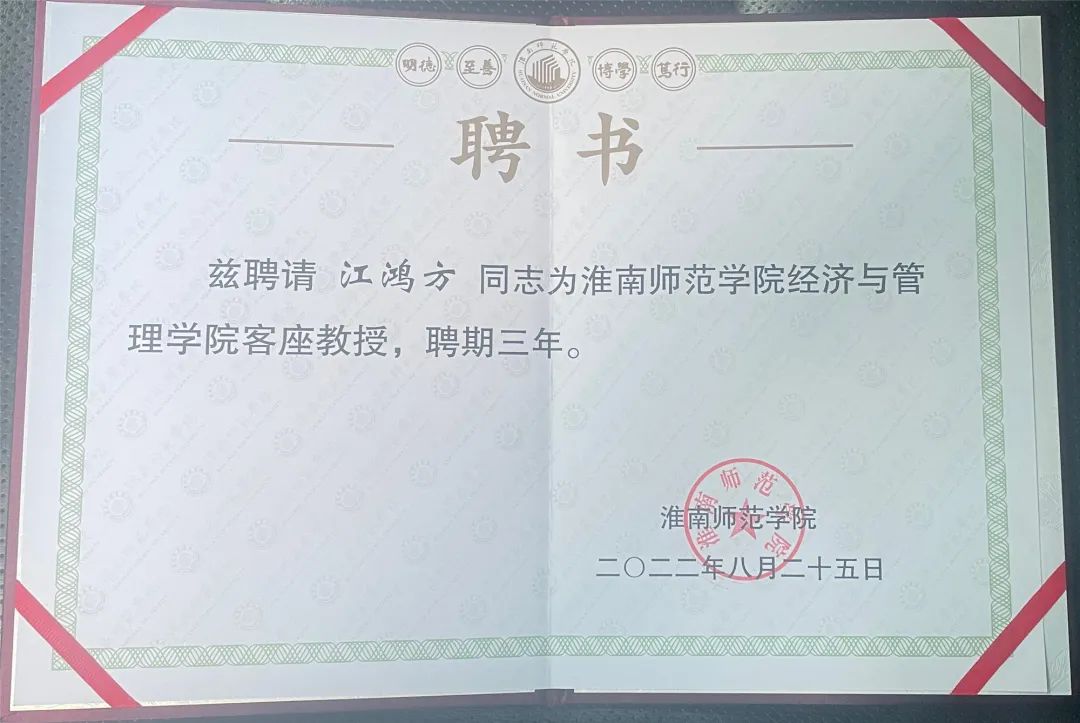 8月25日下午,淮南师范学院客座教授聘任仪式在院区行政楼会议室举行,淮南东方医院集团党委书记、名誉董事长、淮南东方医院管理责任有限公司董事长江鸿方同志在仪式上受聘为淮南师范学院经济与管理学院客座教授,淮南师范学院程刚校长为江鸿方教授颁发聘任证书。