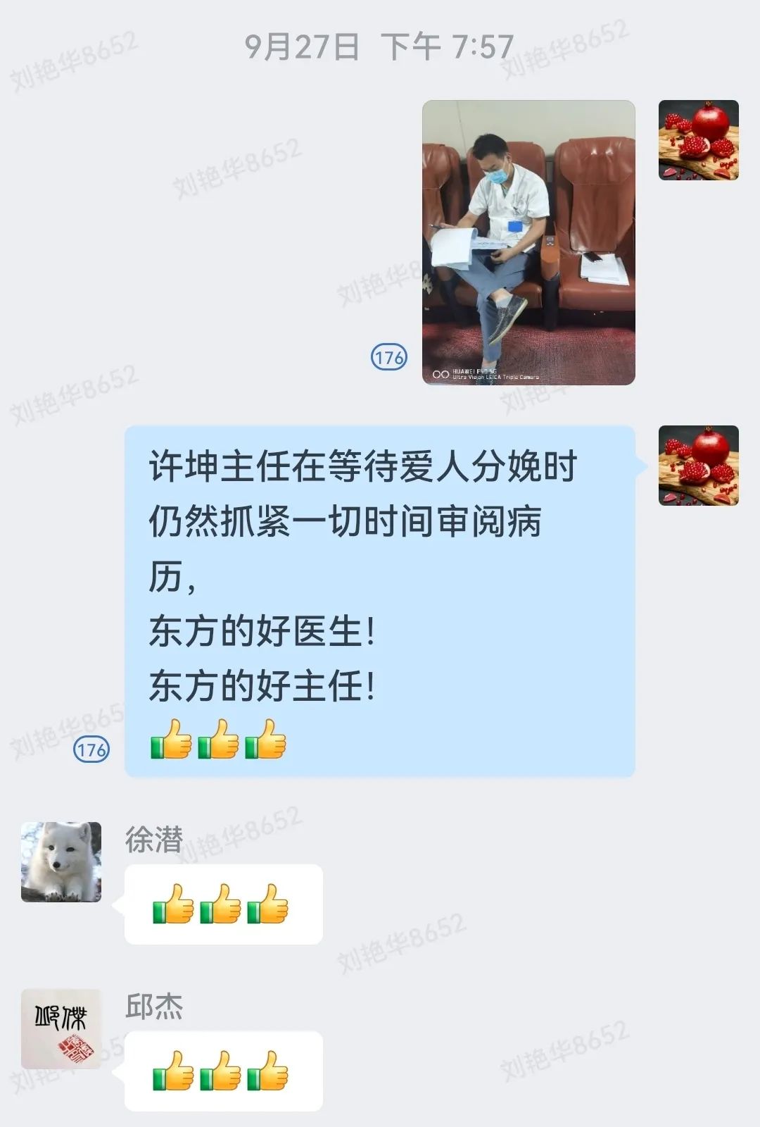 9月27日,当人们在兴致勃勃谈论着国庆度假计划时,淮南东方医院集团总院肾内风湿科主任许坤怀孕的妻子却迎来了临盆的日子。一早,妻子突感腹痛难忍,老母亲说:“怕是要生了,赶紧去医院!”许坤不敢耽搁驾车送妻来东方总院,由于手头工作多并未一直陪伴。9点钟,妻子进入产房,由于过期妊娠、宫缩无力,临盆遭遇艰难挑战……妇产科医生护士们细心指导,采取多种助产措施,一遍遍鼓励着产妇。这是妻子第一次生产,都说妊娠时的疼痛指数高居第一,临产时生理心理备受考验,最需要丈夫和家人陪伴和鼓励。而此时的许坤却在全身心地忙工作,根本无法分身。“马上就要过国庆节了,有很多工作需要处理。我就想着把节前的工作该做的都完成了,不要积压到节后。我要对每一位病人负责,也想着减轻一下同事们的负担……”回忆当时的想法,许坤这样说。由于岳父岳母和自己父亲都不在身边,眼下只有母亲一人,不能像寻常家庭孕妇临产时家人前呼后拥守在产房门外,“想想也觉得挺对不住老婆的!”