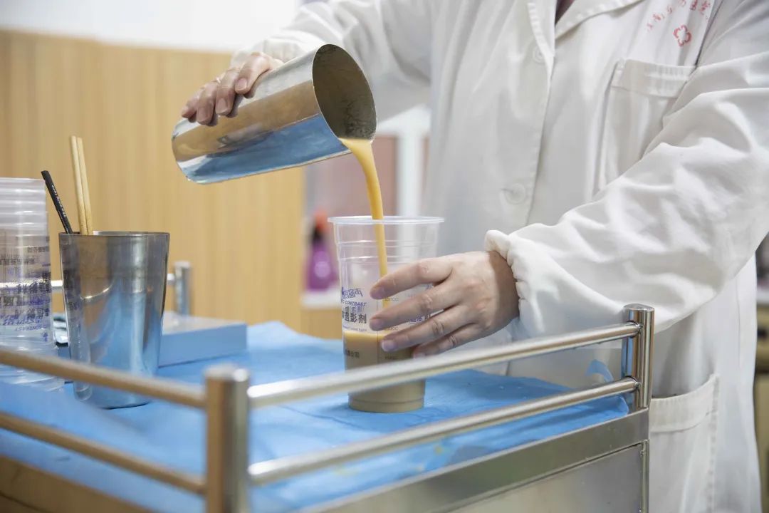 “这个比我想象的还要好喝一些,有炒米的香味”,在东方超声诊断科的等待区,正在接受检查的患者现身说法,打消了其他待检人员的顾虑。据了解,胃肠超声造影剂是由大米、黄豆、藕粉、陈皮、薏苡仁和山药等材料经熟化配制而成,配料感觉像是腊八粥,外表看起来像是一杯奶茶,喝起来的口感像是芝麻糊,纯粹是食品型造影剂,无任何副作用。