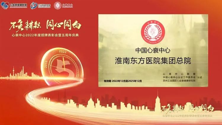 2022年12月10日,中国心衰中心年度授牌表彰会在2022中国心血管健康大会上进行。淮南东方医院集团总医院获“中国心衰中心”授牌,标志着该院在心衰患者的评估、规范诊疗与管理上达到国家级标准水平,这也是该院第二个获得认证的“国字号”心血管疾病管理中心。