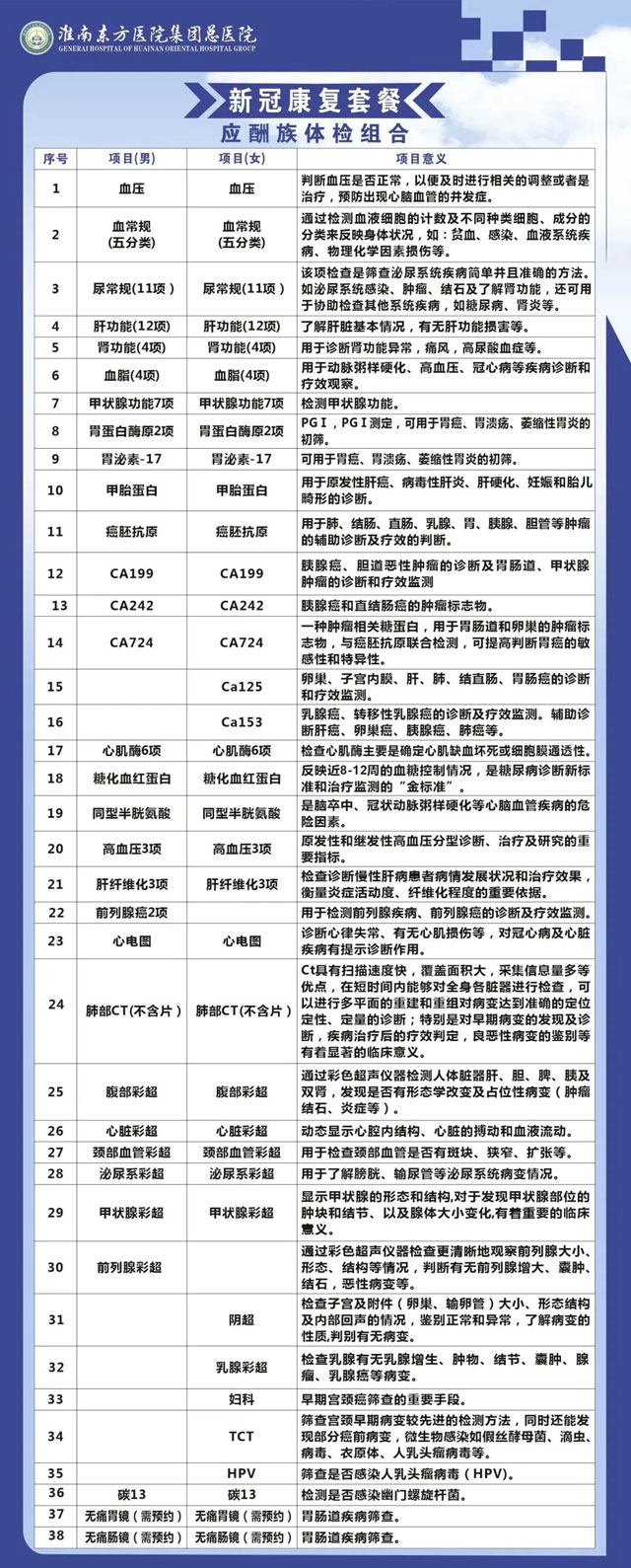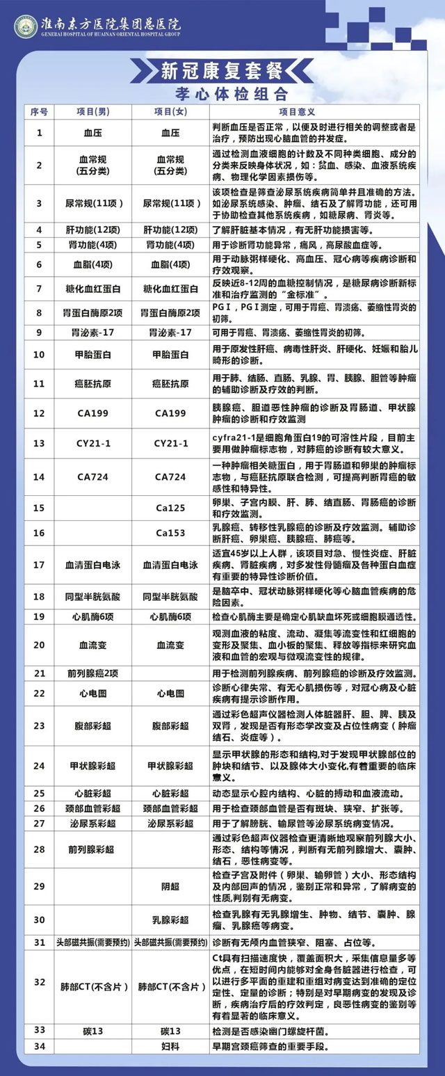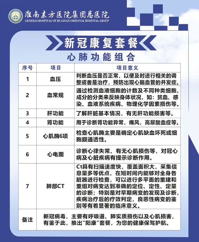 淮南东方总院体检中心现针对不同情况推出四套“阳康”特惠体检套餐,在一天内就可完成检查,用最快捷方便的方式为您的健康保驾护航!相较于日常体检,四项“阳康”套餐对于个人和团队都有大幅优惠,同时将由专家将为您解读报告、进行疾病风险评估,对于筛查出有病毒性肺炎、病毒性心肌炎等疾病的高危客户,医院会安排尽快就诊,提供一站式服务,努力为大众健康保驾护航。