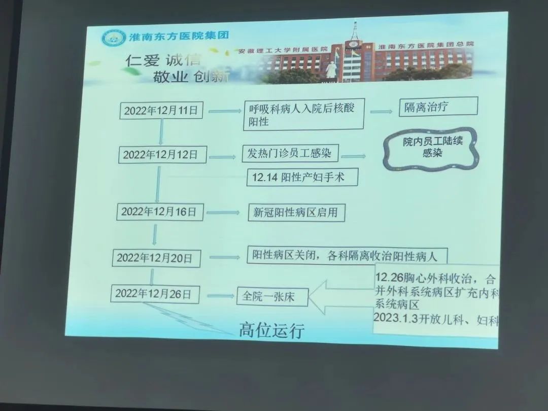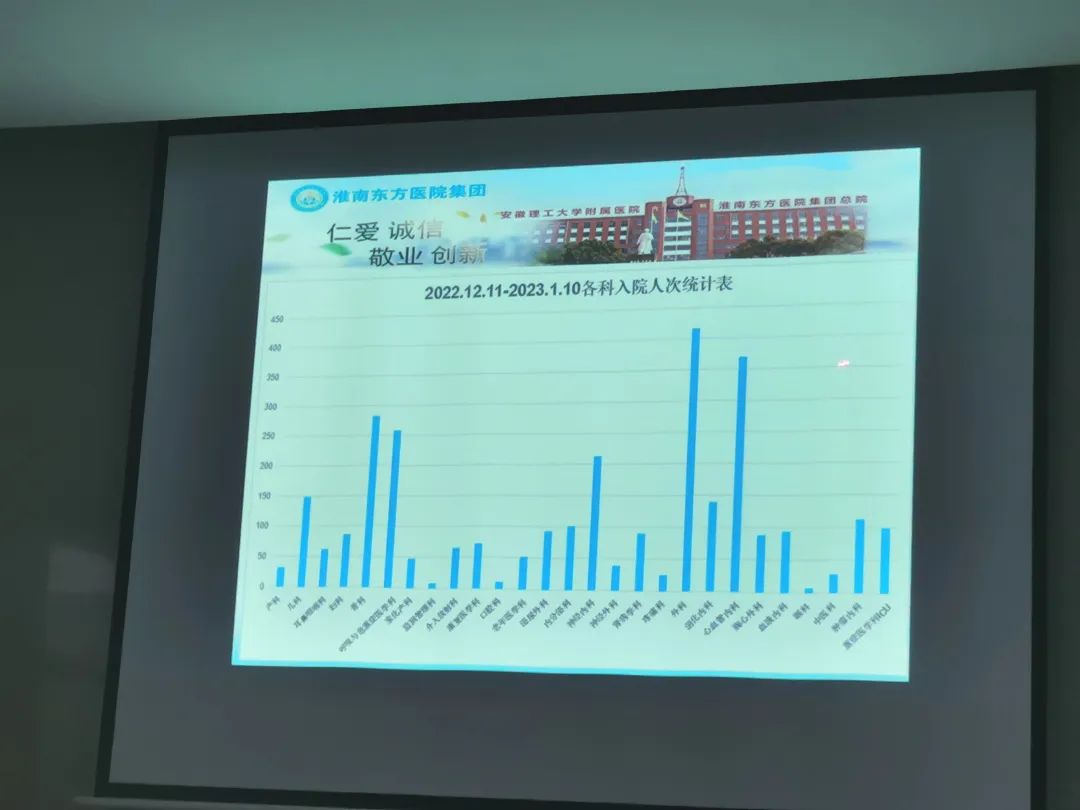 会议首先由朱胜副院长通过PPT的形式向大家介绍了自去年12月11日以来,我院在应对新冠感染诊治工作中开展的一系列工作,通过大量数据图表的精准展示,为大家呈现了东方人这不平凡的30天。在总结成功经验的同时,对我院应对工作做了深入的思考,如:床位问题、护理人员紧张问题、物资药品紧张和短缺问题等,就下一步的疫情处置、病人收治、安全医疗、三甲创建工作作了详细部署。