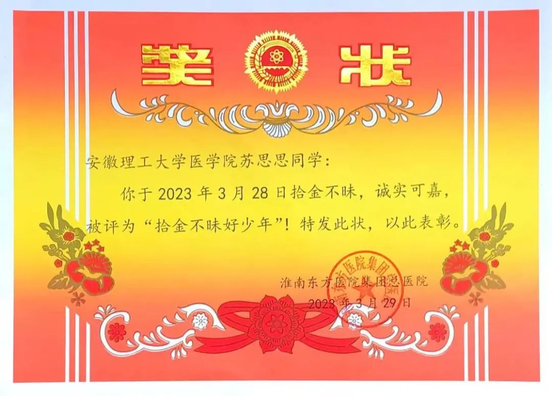 “芝兰生于幽林,不以无人而不芳;君子修道立德,不为穷困而改节”。拾金不昧是中华民族的传统美德,苏思思同学拾金不昧的精神受到医院上下一致的好评和赞叹:“这位姑娘俯下身去拾起的是中华民族传统美德,送还的,是一颗至纯至美的心!”为了弘扬拾金不昧的精神,传递正能量,东方总院科教科为苏思思同学颁发奖状,江永强董事长亲手为她送上500元奖励金,鼓励苏思思同学好好学习,并承诺会尽快让她拾到的吊坠物归原主。