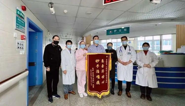 康复出院时,周某某的家属特意向总院李枫院长、心内科汪蛟龙主任及CCU全体医护人员赠送了锦旗,表达了对医护人员的深深感激之情。周某某一家的感激之情,是对淮南东方医院集团总院胸痛中心与广济医院胸痛救治单元救治水平的最好认可,同时也体现了医护人员救死扶伤的崇高使命。