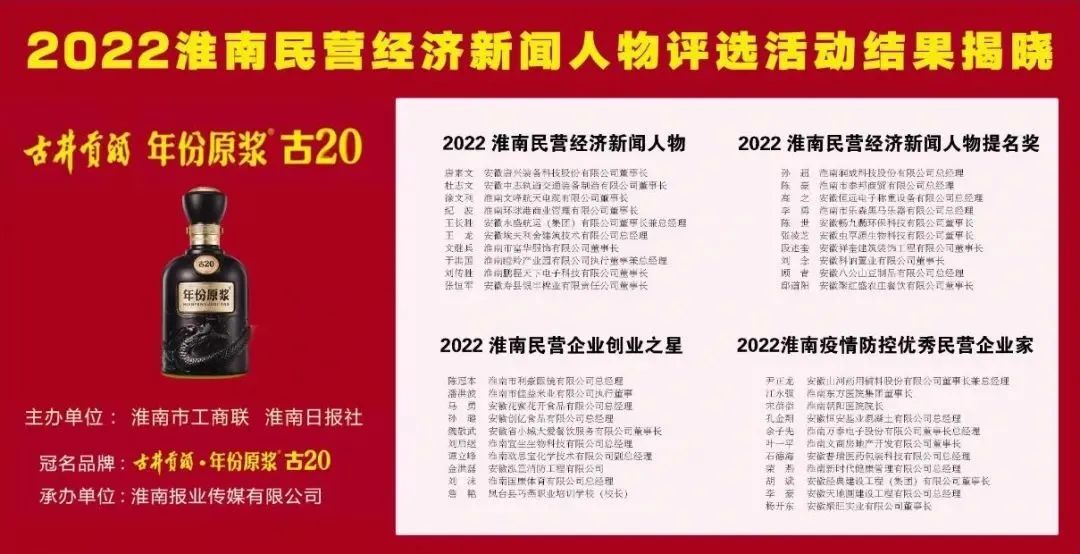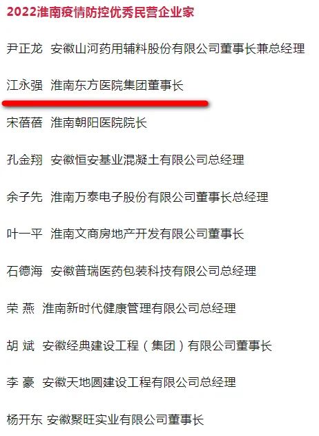 为推出一批富有创新精神和社会责任感、对淮南经济建设作出突出贡献、具有行业示范性和社会影响力的民营经济新闻人物,为淮南市经济社会发展营造良好氛围,淮南市工商联与淮南日报社联合举办2022淮南民营经济新闻人物评选活动。在评选中,淮南东方医院集团董事长江永强脱颖而出,荣获“2022淮南疫情防控优秀民营企业家”荣誉称号。