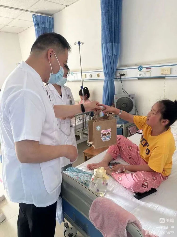 医护人员走进病房,给孩子们送去礼物。收到礼物的小朋友们露出了开心的笑容,并礼貌地向医护人员表达谢意。儿科病房内顿时充满了欢声笑语,医患之间心更近了,情更浓了……