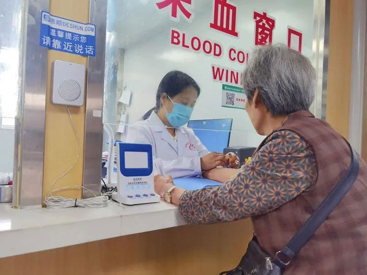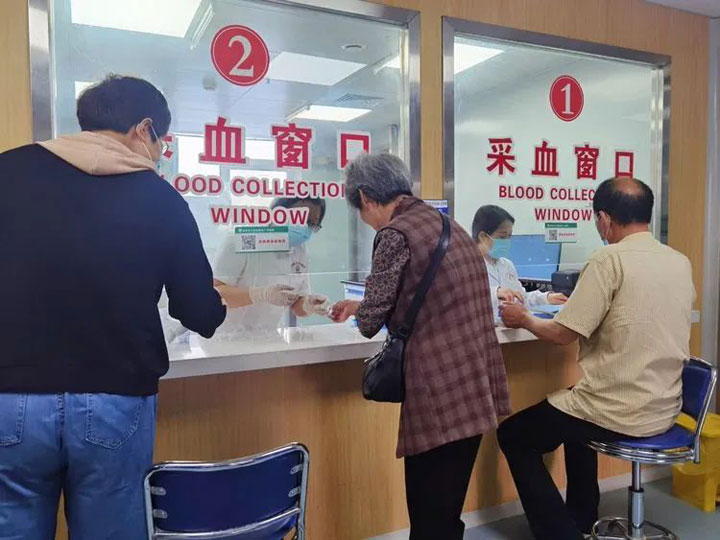 “您好,请把手里的单子给我。”“棉签按好,这是尿杯等下去留小便标本。”“厕所在这,我带你去。”“抽好血的居民可以去三楼做超声心电图,楼梯旁边有电梯,慢一些。”清晨的门诊大厅,工作人员的温馨提示听得格外清楚。