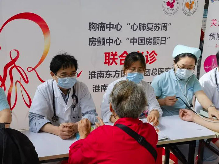 2023年6月6日是“中国房颤日”。当天上午,淮南东方医院集团总医院胸痛中心、房颤中心、淮南市心血管病研究所和急诊科在新门诊大楼一楼大厅举行了联合会诊和心肺复苏操作演练活动。本次活动得到了前来东方总院就诊患者及其家属的欢迎及赞赏。