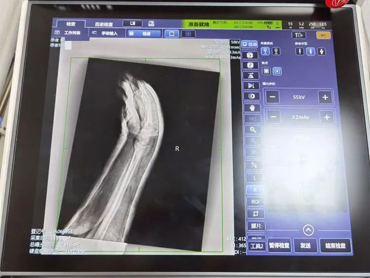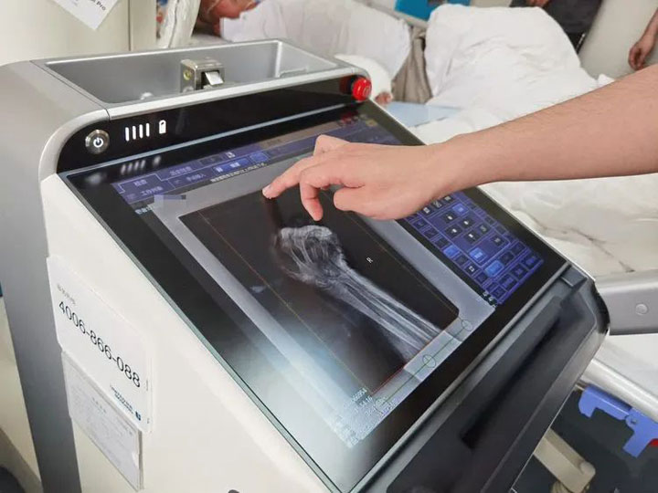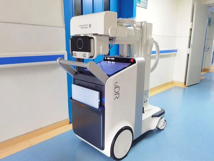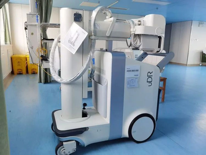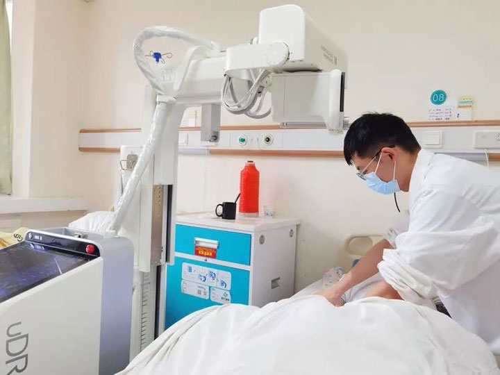 影像科袁晨主任介绍,移动式DR床旁摄片机,即可以移动的DR(直接数字平板X线成像系统)设备。与传统X光成像相比,DR(直接数字平板X线成像系统)采用数字影像平板探测器取代传统胶片,直接捕获X线影像,并转化为高清晰数字图像。具备操作方便、图像清晰、成像快捷、辐射量低等特点,而可移动DR床旁摄片机,占据更小空间,具有良好的移动通过性,可以在病房直接完成曝光,支持床旁成像检查。能够为临床提供更加便捷、及时有效的影像信息,使患者在床旁即可快速获得影像诊断和治疗。