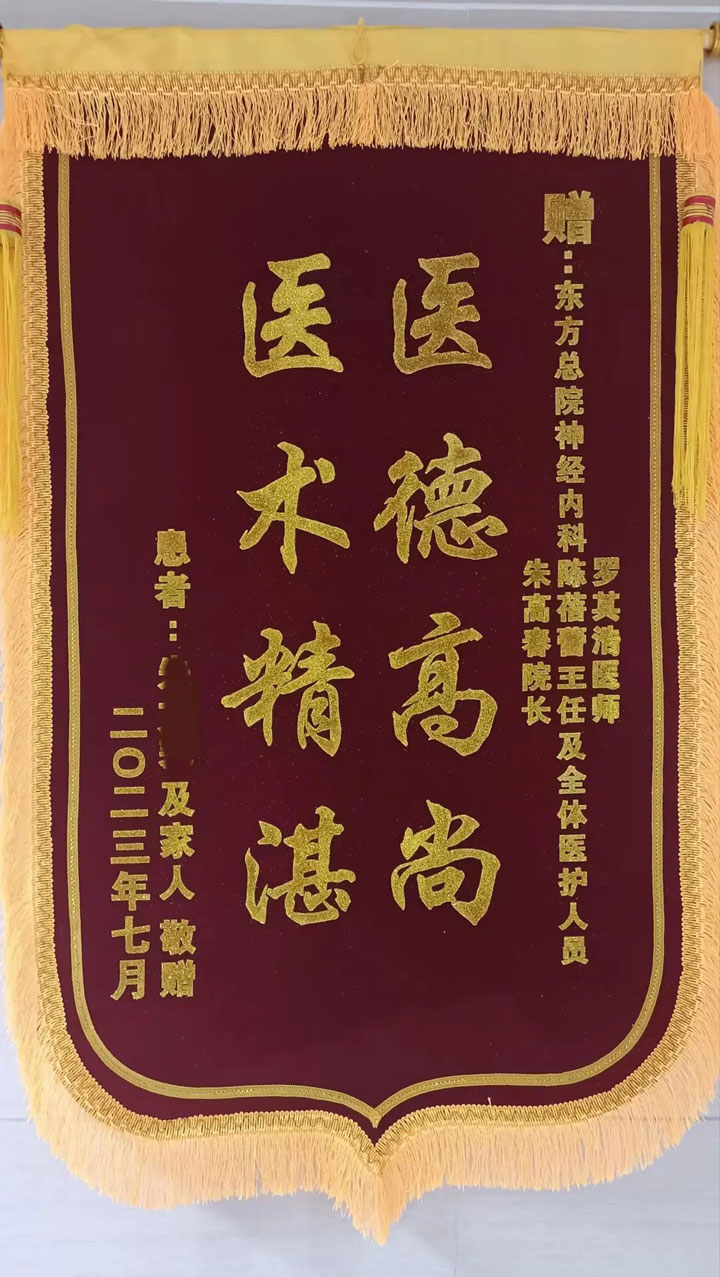 无独有偶,61岁的朱女士在家晨练时,突然言语不清,症状持续了二十多的分钟然后有所缓和,可是没过多久又出现这种症状,短时间内三次言语不清让朱女士的家人不由警觉起来,就立马带着朱女士来医院检查。检查结果发现朱女士出现了脑梗的症状,因为脑梗的最佳溶栓时间是3~5个小时,为了让朱女士得到最佳治疗,朱院长没有耽误立即为她安排了溶栓治疗,因为救治及时朱女士很快症状就得到了缓解,也没有留下任何后遗症。为了表示感谢朱女士便给朱院长和管床医生罗其浩分别送了红包,朱院长和罗医生依旧将红包充到了朱女士的住院费里。见朱院长不愿收红包,隔天朱女士便将“医德高尚,医术精湛”的锦旗送到了朱院长的手中。朱女士说:“朱院长,红包不收,这锦旗你们一定要收下,不然我都不知道该如何表达自己对你们的感谢了。”