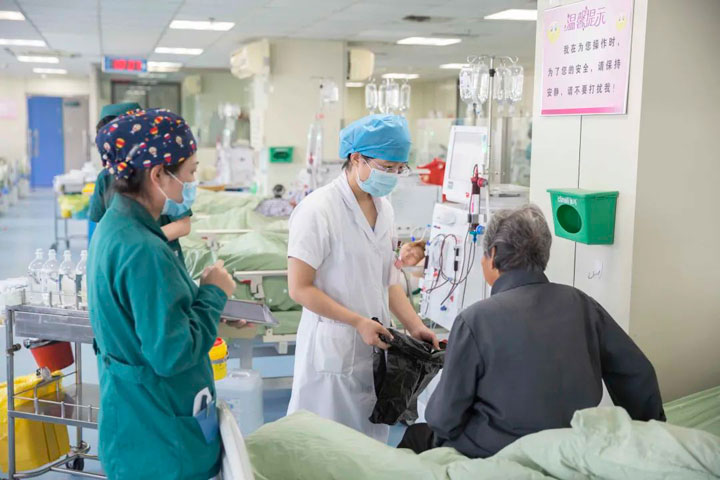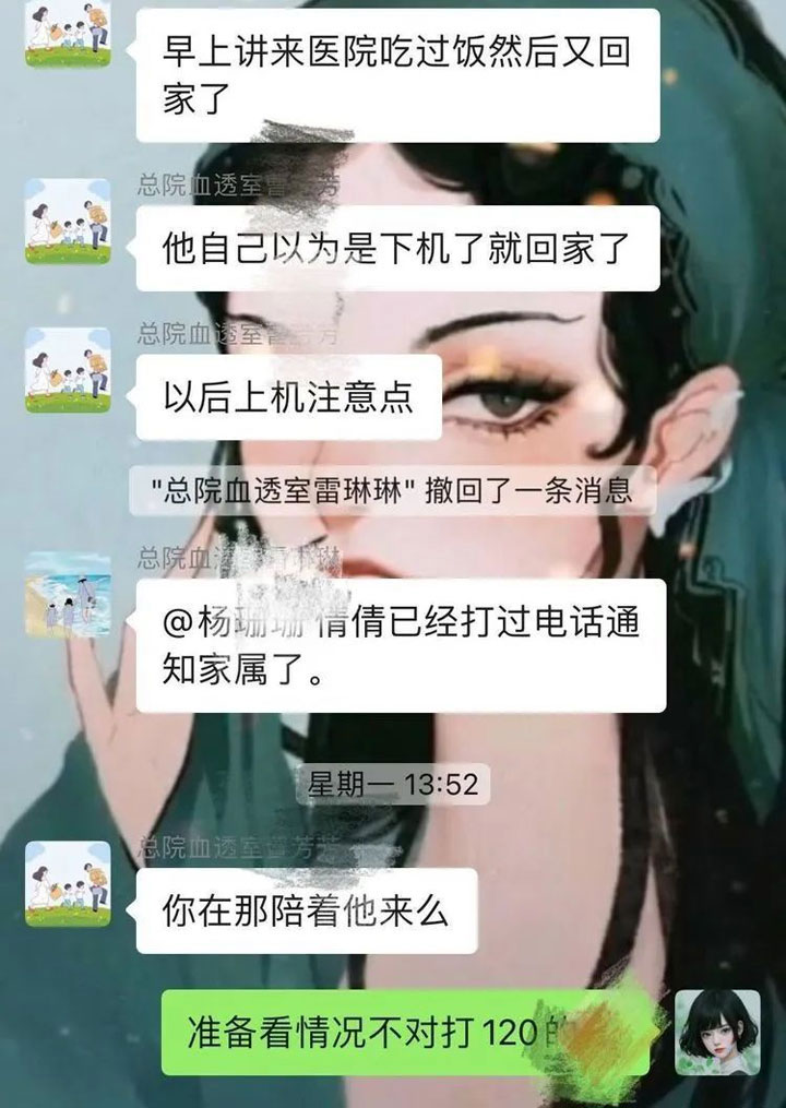 患者金爷爷是一名透析3年的患者,前些日子因疑似患上了老年痴呆,加上腿脚不便,家里又有特殊原因无人接送透析,所以他成为了科室的重点保护对象。只要金爷爷出现在透析室,医护人员们就及时的轮椅推到他的面前,等他上了轮椅,再送到床边。