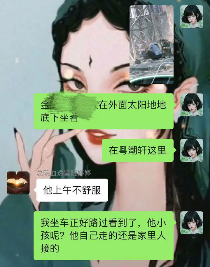 8月29日中午,血透室杨珊珊护士在回家的路上经过粤潮轩酒店附近时发现了一个熟悉的身影,离近一看,居然是金爷爷。烈日当头,花白年纪,一人坐在无任何遮挡的太阳底下,顿时让杨珊珊护士产生了疑问。“老爷子的家人在哪?为什么会在这里?”一连串的问号得不到解惑,杨护士下车来到金老爷子身边,但任凭杨护士如何搭话,老爷子就是不理不睬,一番询问无果后杨护士联系科室里在班的同事,并让同事联系金爷爷的家人,在家属未到之前,杨护士寸步不离,生怕出一点意外。
