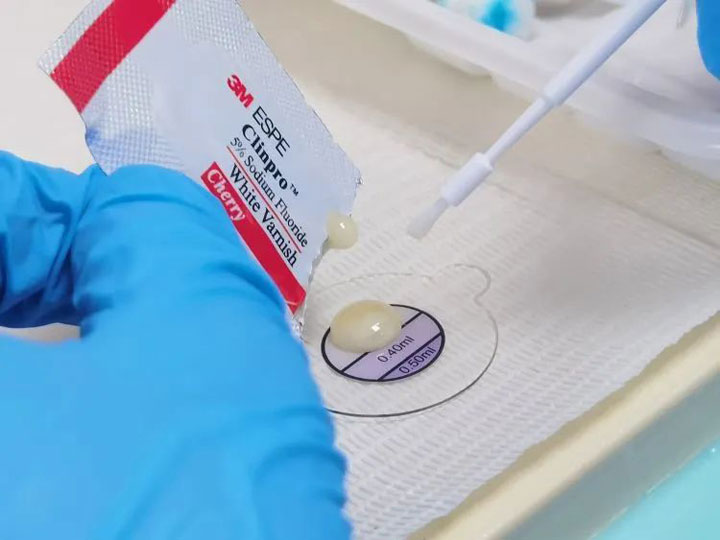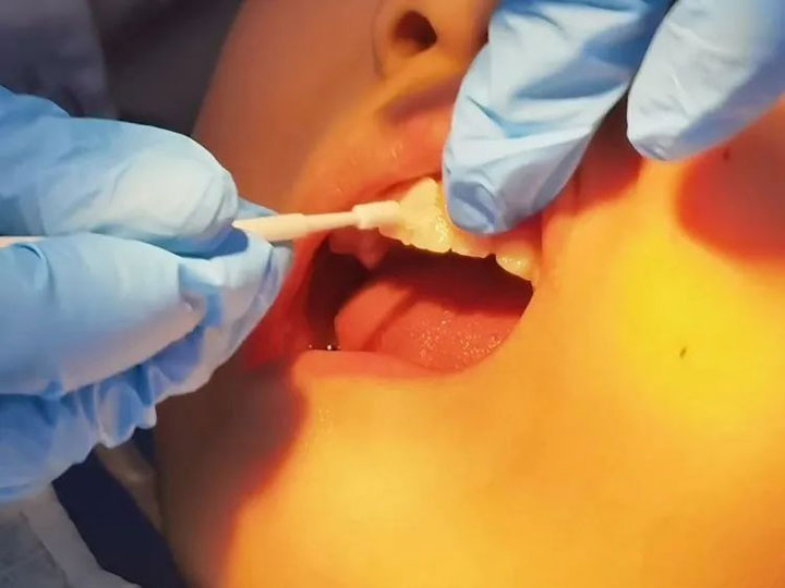 3、涂氟:口腔科医生用小刷子蘸氟保护漆,将其通过正确的方式涂擦牙齿表面。