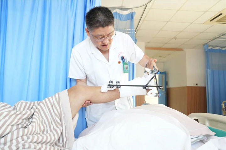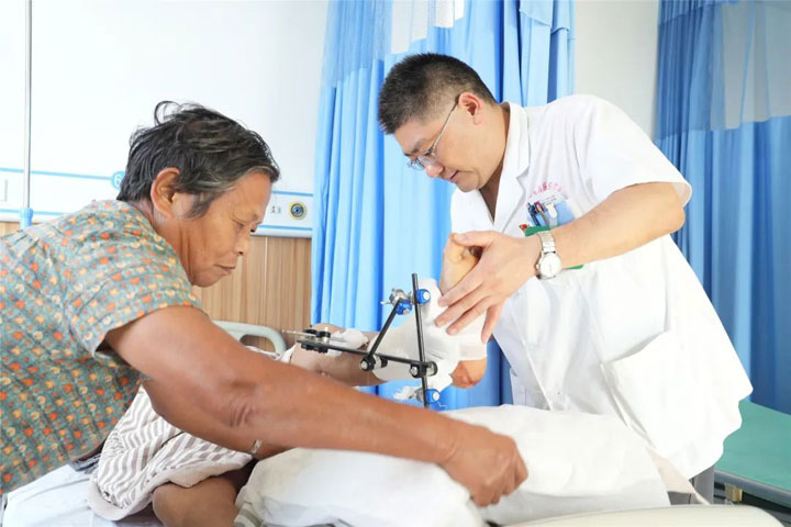 “大夫,我父亲不会有事吧,请你一定想办法救救她……”年逾古稀的男患者吴某外出活动时不慎摔伤,左踝部疼痛不已,顿时伤口流血无法行动。家人心急如焚,立刻拨打120急救,急诊马上予以“左踝清创缝合+跟骨牵引术”处理并收治入院。仪器进一步检查发现,老人左胫腓骨下端粉碎性骨折,且断端错位、周围软组织肿胀。吴跃虎主任结合检查诊断为:左开放性胫腓骨下端粉碎性骨折、脑梗死、高血压病。这同样面临着患者年纪大、基础病多、手术风险大的考验,且患者左胫腓骨下端为粉碎性骨折,在操作难度和预后效果方面提出了更大的要求。吴跃虎略一思考,决定立刻为老人手术。“如果不手术,不仅老人伤痛无法平息,伤处软组织感染、骨折刺激伤口及骨折不愈合感染骨髓炎等风险更意味着患者今后可能需长期卧床,增加患者痛苦和家人护理难度,久而久之将是对生命安全的极大挑战!”明知山有虎,偏向虎山行。在经过精心准备后,吴跃虎率团队实施“左腓骨骨折切开复位内固定+胫骨骨折闭合复位外固定术”,一“内”一“外”,层次分明,条理清晰,设计周密,操作精准,将粉碎性骨折进行拼合、整理、复位,手术流畅、毫无瑕疵。术后,患者恢复好,不仅解除了伤痛,而且踝关节功能渐恢复。患者家人长舒一口气,连连称赞。