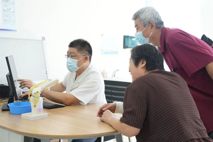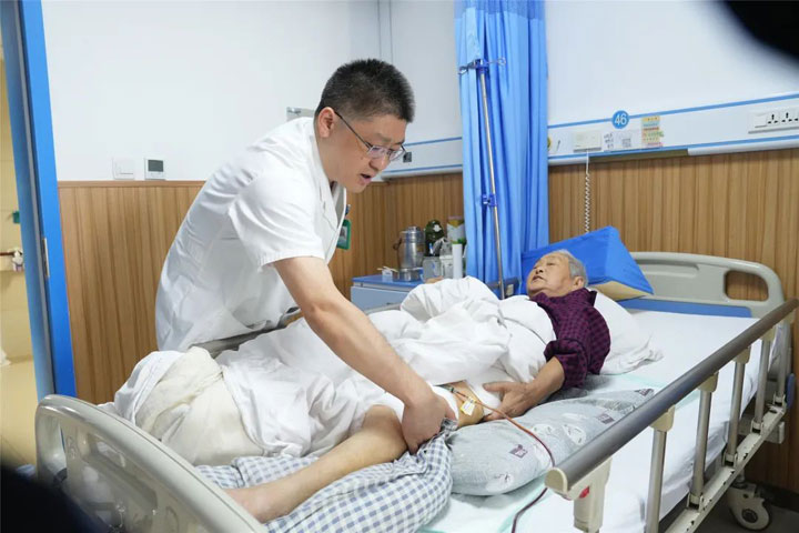 一位耄耋高龄的女性患者左腿骨折,家人将其推进东方总院骨科求治。吴跃虎仔细查体,询问病情,结合CT影像诊断为“左股骨转子间骨折”。同时发现,老人还患有II 型糖尿病、冠状动脉粥样硬化性心脏病,由于患者年事已高又患有多种较为棘手的基础病,手术治疗具有创伤性、风险性,难度较大。这些也让患者家人患了难。吴跃虎一边为病患分析病情,安慰缓解压力,一边着手准备详尽的手术方案。在取得家人的支持后,他带领团队亲自主刀,为患者实施了“左股骨转子间骨折闭合复位髓内针内固定术”。手术紧张而高效地进行,吴跃虎娴熟操作、丝丝入扣,团队默契配合、有条不紊……历经一个多小时奋战,手术成功。患者术后恢复较快,数天后便在家人辅助下下床活动。住院期间,医护人员悉心照料,态度和蔼,不厌其烦。不久,老人家出院,家人握着吴跃虎的手说:“我们本来以为会很麻烦,甚至有老人将不久于人世的不好预感,没承想,吴主任一台手术救了老人。在家门口也能得到这样精湛的手术治疗,是我们的福气!真不知该怎样表达感激和敬佩之情……”