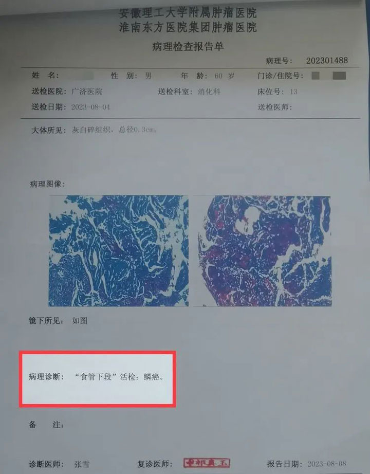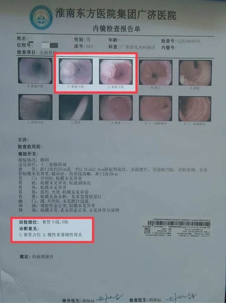 因为“食欲减退3月”,家住蔡家岗的吴师傅就诊广济医院。问诊查体发现他食欲减退数月的同时,还有“反酸、嗳气,伴腹部(主要位于脐上)阵发性隐痛”等不适。为了进一步明确诊断,接诊的消化内科团队为其行无痛胃肠镜检查,无痛胃镜示:1.食管占位2.慢性非萎缩性胃炎。后病理提示:食管下段鳞癌。