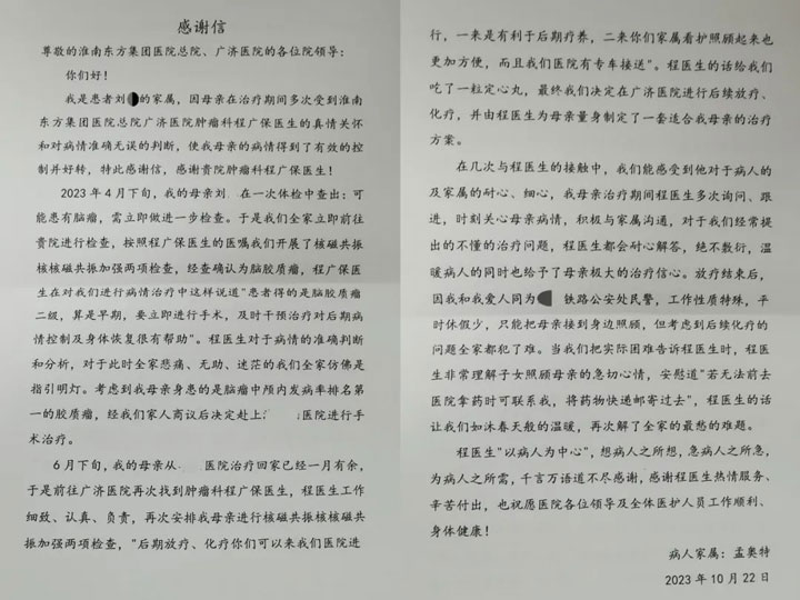 程医生的一言一行让患者和家属十分温暖,当得知老人放疗结束后,6个周期的化疗还需要定期来复诊开药时,老人一家再次犯难了。得知老人将被子女接到外省照顾,可能无法及时来开药时,程医生再次彰显了好医生的担当。“这样,你们后面如果没有办法来拿药就联系我,我开好给你们邮寄过去。”想病人所想,急病人所急。程医生的话,让患者一家再次感受到春天般的温暖,感动之余,家属将故事记录下,伴随着感谢寄到了东方医院集团总院领导的手中。