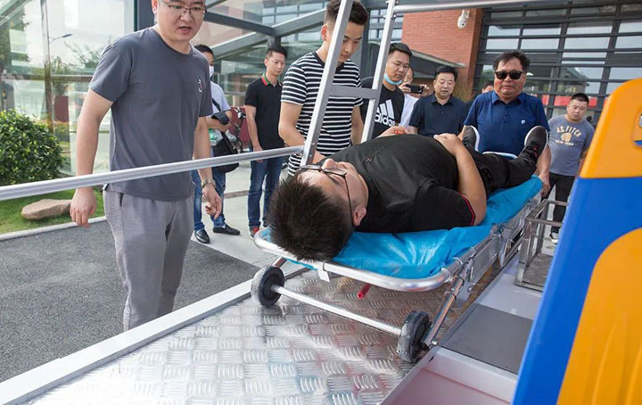 据了解,为了服务不同病患,此次东方总院购买的两辆摆渡车在配置上还略有区别:其中一辆车配置的普通三排座椅和货架,主要方便一些腿脚不便的病人和老年病人安全就医;而另一辆则配置了3个普通座椅,同时预留了放置担架的位置,可以实现急诊病人、危重病人的快速转运。