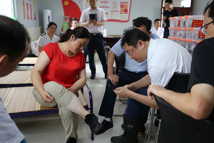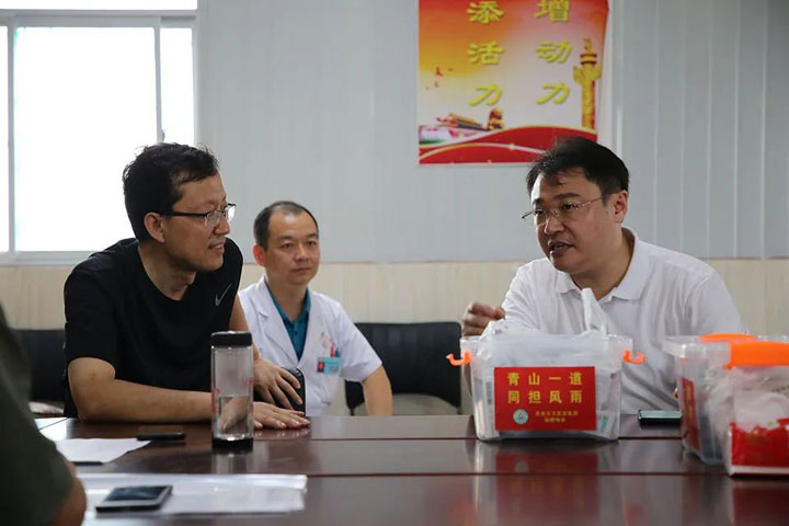 在问及驻地防汛人员有什么需要时,江总经理了解到,受气候和水情的影响,个别防汛驻地的同志患上了皮肤疾病,没有办法得到及时的治疗。江总随即提出把患病的人员请到指挥部,细心查看了患者病情并拍摄照片传回东方医院,安排皮肤科专家进一步开展诊疗救治工作。他表示:“无论是防汛抢险的工作人员还是牺牲家园承担泄洪的父老乡亲,他们都是我们的英雄。这里受灾严重,工作生活条件艰苦。作为医务工作者,我们会尽最大努力为你们开辟健康通道,为防汛抗灾工作保驾护航。”