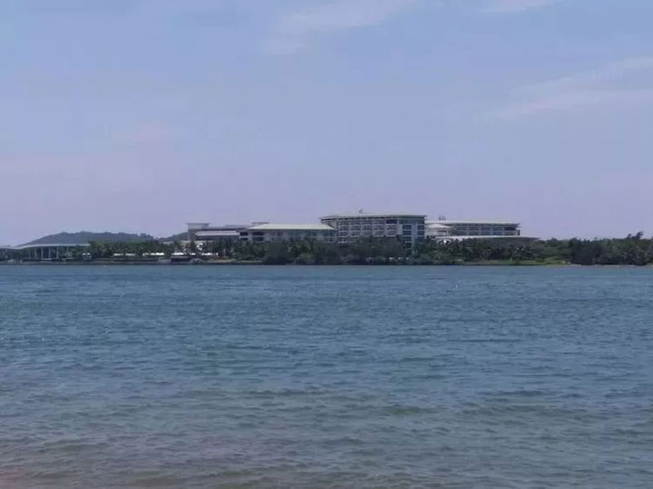 从博鳌会场出来,我们在距会场东面仅几百米处的旅游专用码头,乘游轮登上不远处的玉带滩。玉带滩在万泉河、九曲江、龙滚河三江交汇处,是一条自然形成的地形狭长的沙滩半岛,又名金沙滩。站在玉带滩高处向两边望去,外侧是烟波浩淼一望无际的南海,内侧则是湖光山色的万泉河……