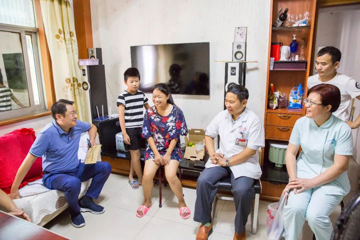 刚刚这一幕就发生在8月30日的清晨,在东方医院集团总经理江永强的带领下,总院副院长范培武、肾内科主任朱明久、外科支部书记王翀、肾内科护士长陈廷霞一行带着淮南东方医院集团的爱心和温暖来到了江陈社区黄道伦和姚娟的家中,为他们送上2000元特困患者救助基金和鸡蛋、牛奶等慰问品。