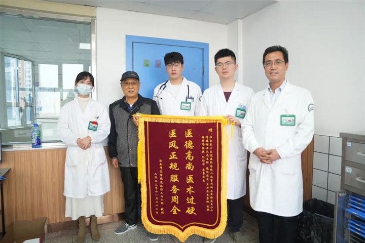 近日,虽然天气寒冷,但心血管内科却上演了暖心的一幕,出院一年的郑大爷将一面写有“医德高尚医术过硬,医风正规服务周全”的锦旗送到了心内科,感谢心内科医疗中心李枫院长、汪蛟龙主任以及全体医护人员对他的救治和精心护理。