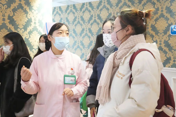 在参观过程中,同学们首先来到妇产科,直观感受新生儿如何沐浴护理,随后参观东方旭日母子中心、云影像中心、整形外科、国医堂等科室。同学们对东方总院先进的医疗设备和优美的医疗环境赞不绝口:“东方医院真的像个大花园一样,我从小最害怕去医院,但是这美丽的环境让我忘记害怕了”另一名同学感叹道,“第一次见到产科家化病房,就像五星级酒店一样,还有那些高端的设备真是让我们大开眼界!”卢明霞护士长应邀在淮南师范学院为学前教育专业的同学们进行《0-3岁婴幼儿的喂养与护理》的课程教学工作,除了传授大家婴幼儿的生长发育、喂养以婴幼儿常见疾病的护理措施等专业知识以外,她还经常跟同学们分享自己的工作经验,介绍淮南东方医院集团的大概情况,百闻不如一见,护士长还定期带领学生们来到东方总院参观学习。